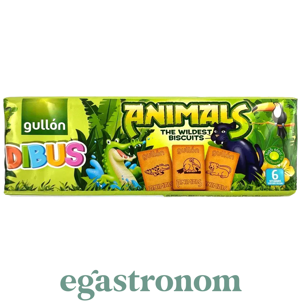 Бісквітне печиво Gullon Dibus Animals із зображенням тварин Іспанського виробництва. Прямокутні бісквітні печива гулон, на кожному із яких намальовані тварини, що мешкають в лісах, саванні, джунглях. Печиво виготовляється з турботою про дитячий організм, до його складу входить залізо, кальцій і 6 вітамінів, а також високоолеїнова соняшникова олія (замість пальмових жирів). Дитяче печиво Gullon Dibus Animals — корисне та смачне джерело вітамінів і мінералів. ТОП запити Вафлі купити Засоби захисту шкіри від сонця Соуси гострі Купити мило Купити соус песто Сир дорблю ціна Засіб для виведення плям з одягу
