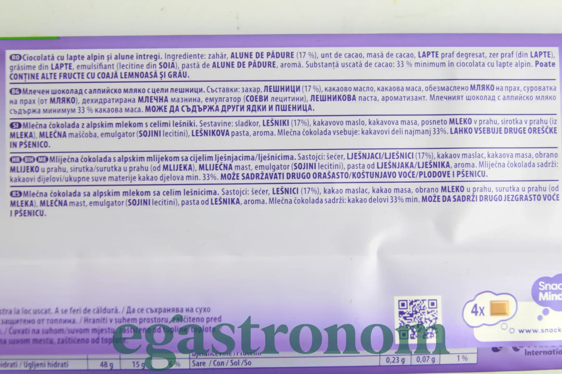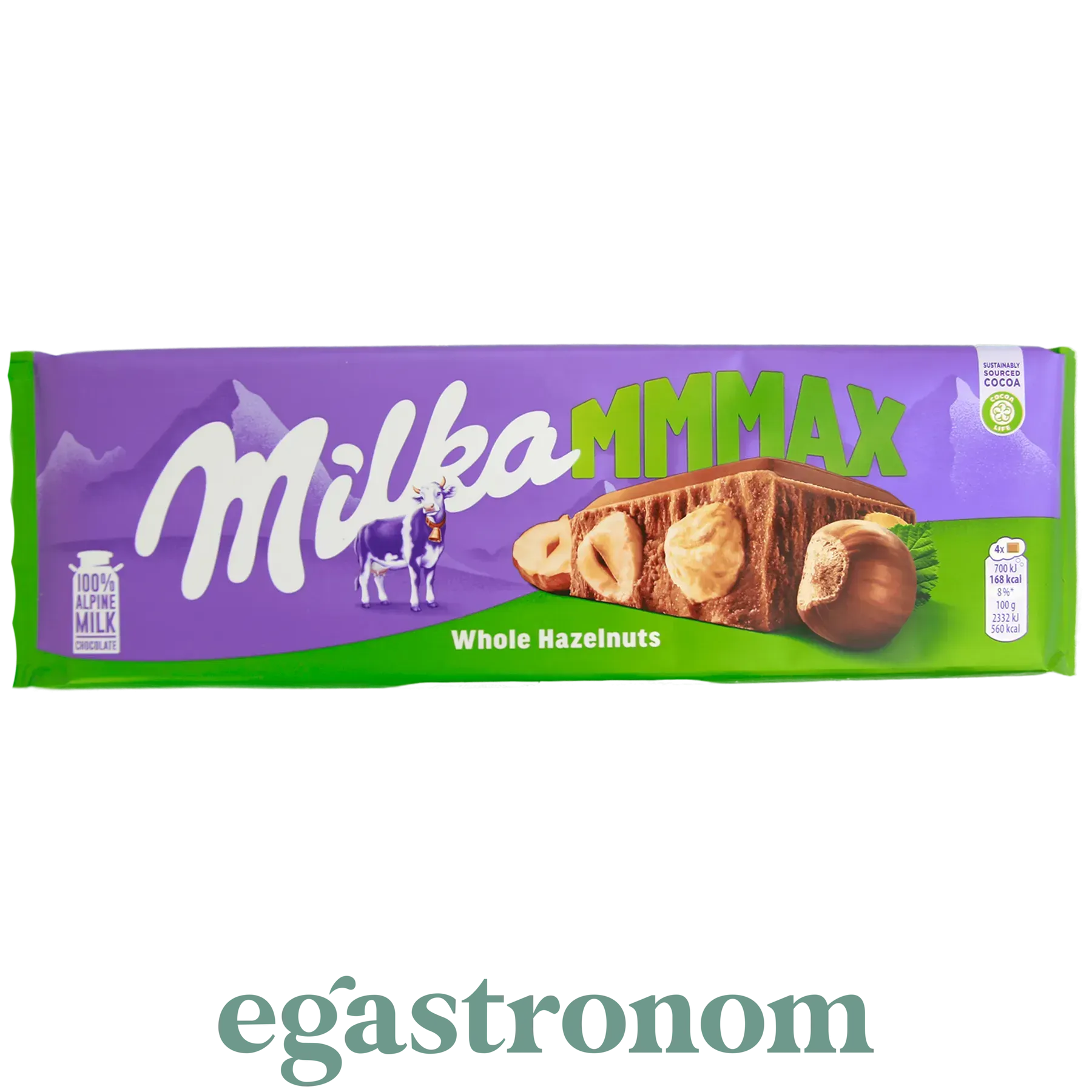 Шоколад Milka Whole Hazelnuts - вишуканий, витончений молочний шоколад, створений для справжніх цінителів елегантних ласощів. Шоколад Мілка стане найулюбленішими ласощами як для дітей, так і для дорослих. Шоколад можна взяти з собою на роботу, на навчання і навіть на прогулянку в якості ситного і дуже смачного перекусу. Завдяки своїй енергетичній цінності Мілка зможе надовго втамувати відчуття голоду і наситити організм корисними калоріями і вітамінами. Містить фундук, який має хрустку, приємну структуру і витончений, неперевершений смак. Молочний шоколад на основі альпійського молока підкорює ніжністю і елегантністю, його вишукана текстура просто тане в роті.