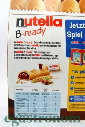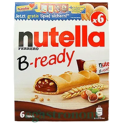 Всіма улюблена шоколадно-горіхова Nutella B-ready 6 вафель в індивідуальній упаковці з начинкою з фундука та пшеничного скоринки Готовий їсти. nutella B-ready - це чудовий «сніданок», коли він повинен піти дуже швидко. Тому що тут «валок» вже змазаний. Хрусткі вафлі у формі міні-багета наповнені чудовою пастою з лісових горіхів Nutella і хрусткими пшеничними чіпсами, так що ви можете почати перекус, коли відчуєте голод. Вранці за сніданком будинку, в перервах між справою в офісі або просто поза домом - Nutella B-ready завжди з вами.