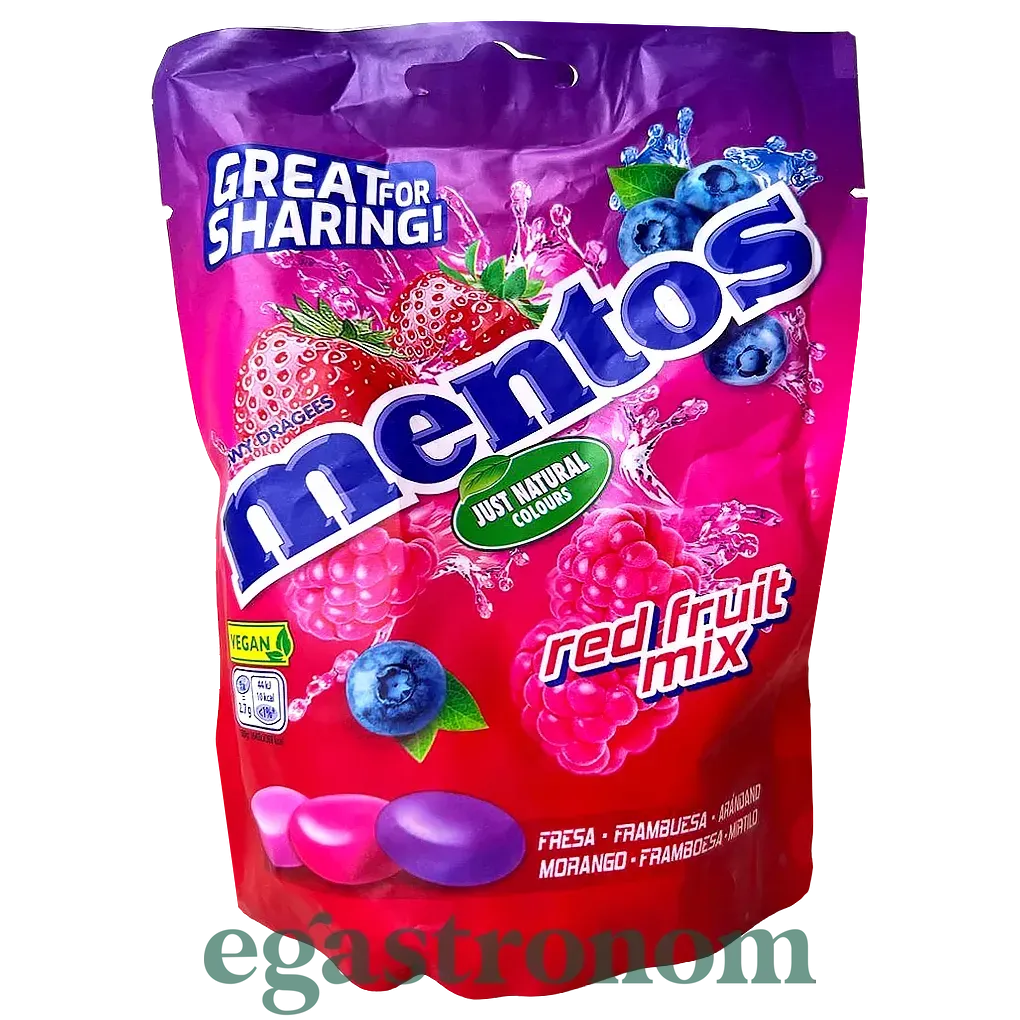 Жувальні цукерки Mentos із соком фруктів — малина, полуниця, чорниця. Яскравий мікс фруктових смаків для любителів ніжних жувальних цукерок.