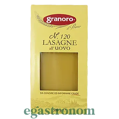 Яєчна лазання Granoro виготовляється за особливим рецептом: на 1 кг пшеничного борошна вищого сорту припадає 4 курячих яйця. Листи виходять тонкими і твердими, але пористими, тому тісто підкреслює смак будь-який з начинок. Це ідеальне рішення для тих, у кого немає часу займатися тістом. Яєчна лазання в приготуванні не викликає складнощів: досить помістити листи на деко, переклавши їх будь-якої начинкою, а потім спекти в духовці. Коробка лазаньї важить 500 г. Для збереження свіжості продукту і задоволення покупців, які не хочуть відмовлятися від смачної страв. ТОП запити