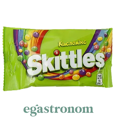 Драже Skittles кислий (мандарин, ананас, малина, вишня, яблуко). Жувальні цукерки-драже Skittles з різнобарвною глазур'ю ось уже кілька десятиліть дозволяють своїм шанувальникам "спробувати веселку на смак".