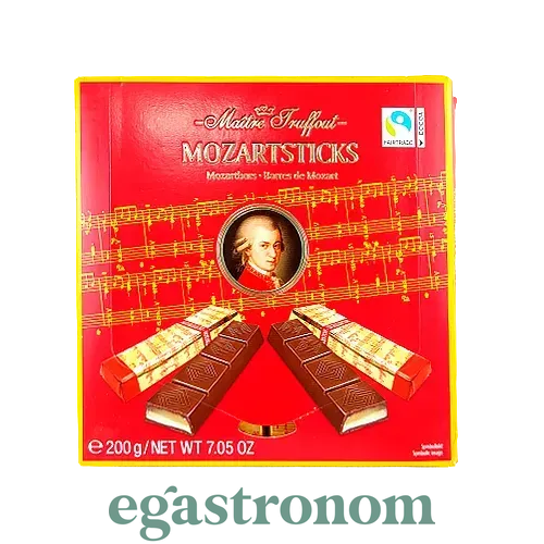 Цукерки Maitre Truffout Mozart Sticks – це палички, вкриті темним шоколадом і наповнені фісташковою начинкою (25%) та марципаном (25%). Вони мають м'яку текстуру і характерний горіховий смак. Солодощі ідеально поєднуються з чашкою гарячої кави, ароматного чаю або келихом вишуканого ігристого вина. Подарункова коробка із 16 паличками Моцарта, загорнуті в золоту фольгу. Ідеально підходить як невеликий подарунок для любителів марципану чи цікавих солодощів