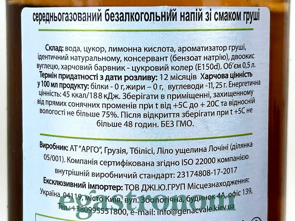 Напій з м’яким, солодким смаком стиглої груші, що поєднується з легкою кислинкою лимона. Має світло-золотистий колір і приємний фруктовий аромат. Кількість на палеті: 780 шт.