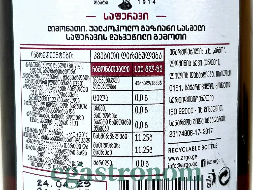 Класичний грузинський лимонад з насиченим виноградним смаком, натхненний сортом винограду Сапераві. Має глибокий рубіновий колір та освіжаючий солодко-кислий смак, ідеальний для спекотного дня. Кількість на палеті: 780 шт.