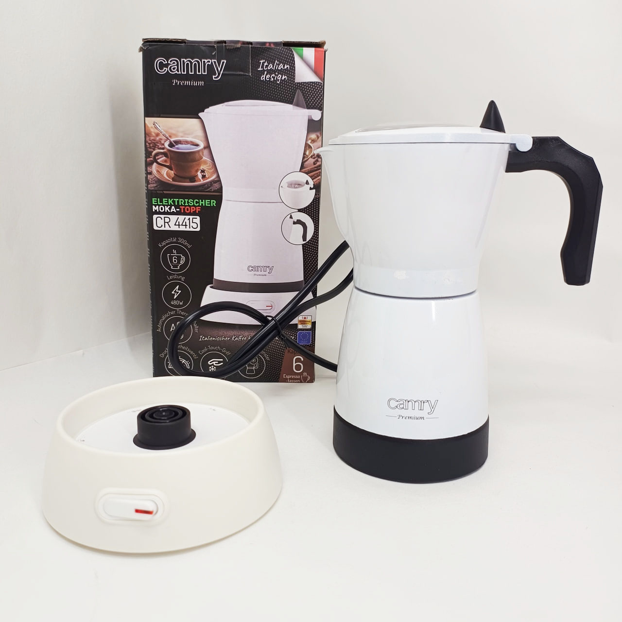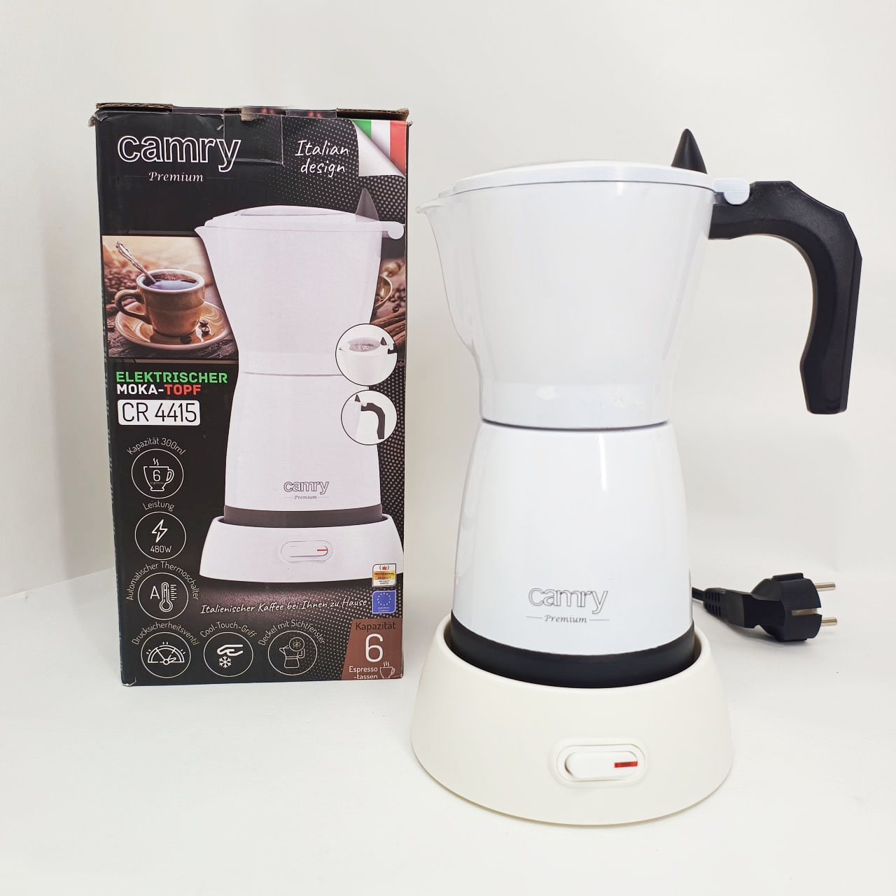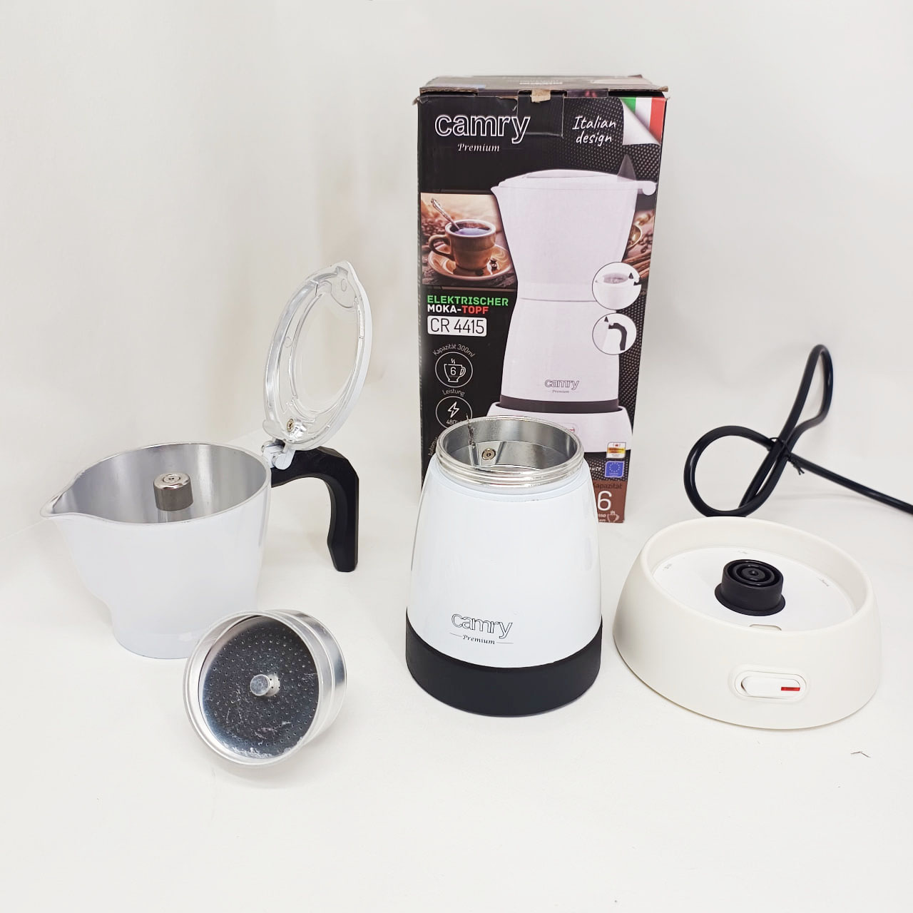Кавоварка Camry CR 4415 – ідеальне кухонне обладнання для кожного любителя кави. Завдяки великій ємності (300 мл) можна приготувати до 6 чашок еспресо. Компактний дизайн ідеальний для подорожей. При заварюванні кави всередині апарату CR 4415 кави. Для виготовлення корпусу пристрою був використаний алюміній – матеріал, який добре працює під час використання. Кожен любитель кави знає, що для отримання ароматного напою необхідний високий тиск. Немає нічого смачнішого за каву, приготовлену вдома. Найбільшою перевагою кавоварки є те, що вона електрична. розетку. основа підходить для шульги та правшів, а крута ручка дозволяє практично відразу налити готовий напій у склянку.