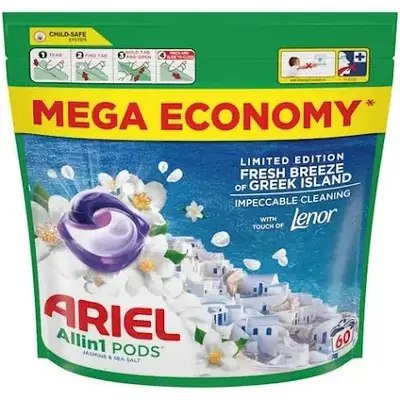 Ariel All in 1 Pods — це високоефективні капсули для прання, які поєднують потужну очищувальну формулу Ariel та розкішний аромат Lenor Fresh Breeze of Greek Island (Jasmine & Sea Salt). Капсули забезпечують бездоганну чистоту, яскравість кольорів і тривалу свіжість білизни після кожного прання.
