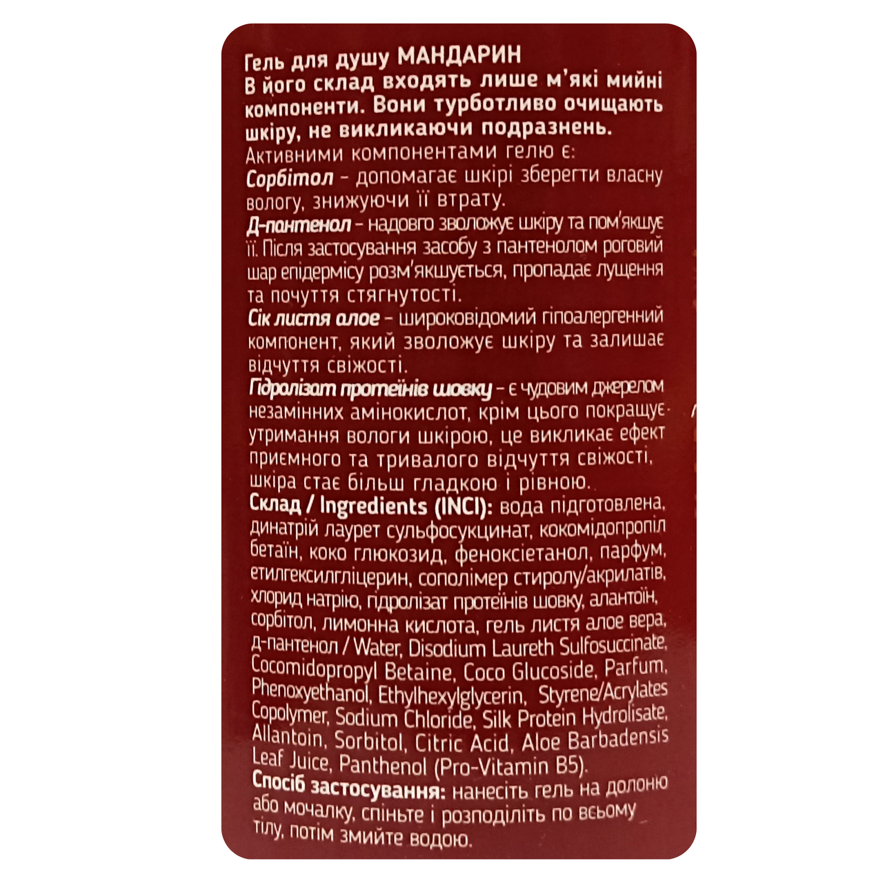 насичує ванну освіжним ароматом мандарина, піднімаючи настрій.Активні компоненти гелю для душуЯк діють активи засобу:алое вера — заспокоює, освіжає та глибоко зволожує;