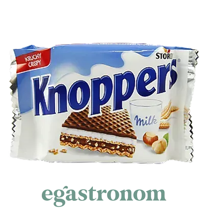 Вафлі Knoppers – це шоколадно-горіхові, повітряні вафлі, які мають три ніжних шари з різною начинкою. Вафля, покрита шоколадом, потім молочний крем, знову вафля, шоколадний крем з подрібненим фундуком і знову вафля. Все разом виходить дуже смачно: хрусткі вафлі, але не жорсткі, в міру солодко, ніжно і дуже шоколадно ТОП запити Таблетки для посудомийних машин ціна Рідкий порошок Сміттєві пакети Купити томатну пасту Сир козячий купити Печиво Камамбер ціна