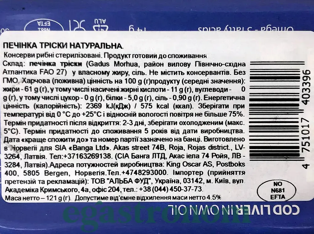 Продукт виготовлений з печінки тріски, яка зберігає всі корисні властивості та насичений смак. Є багатим джерелом омега-3 жирних кислот, вітамінів A і D, а також мінералів, що сприяють здоров'ю серця та імунної системи. Чудово підходить для салатів, бутербродів, паст, а також як самостійна закуска. ТОП запити Борошно Миюче для ванни Сир крем чіз Напої Чаї купити Купити козиний сир Енергетичний напій