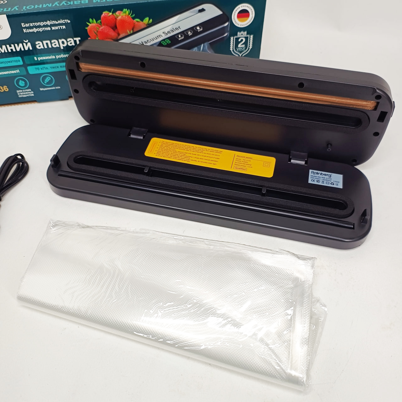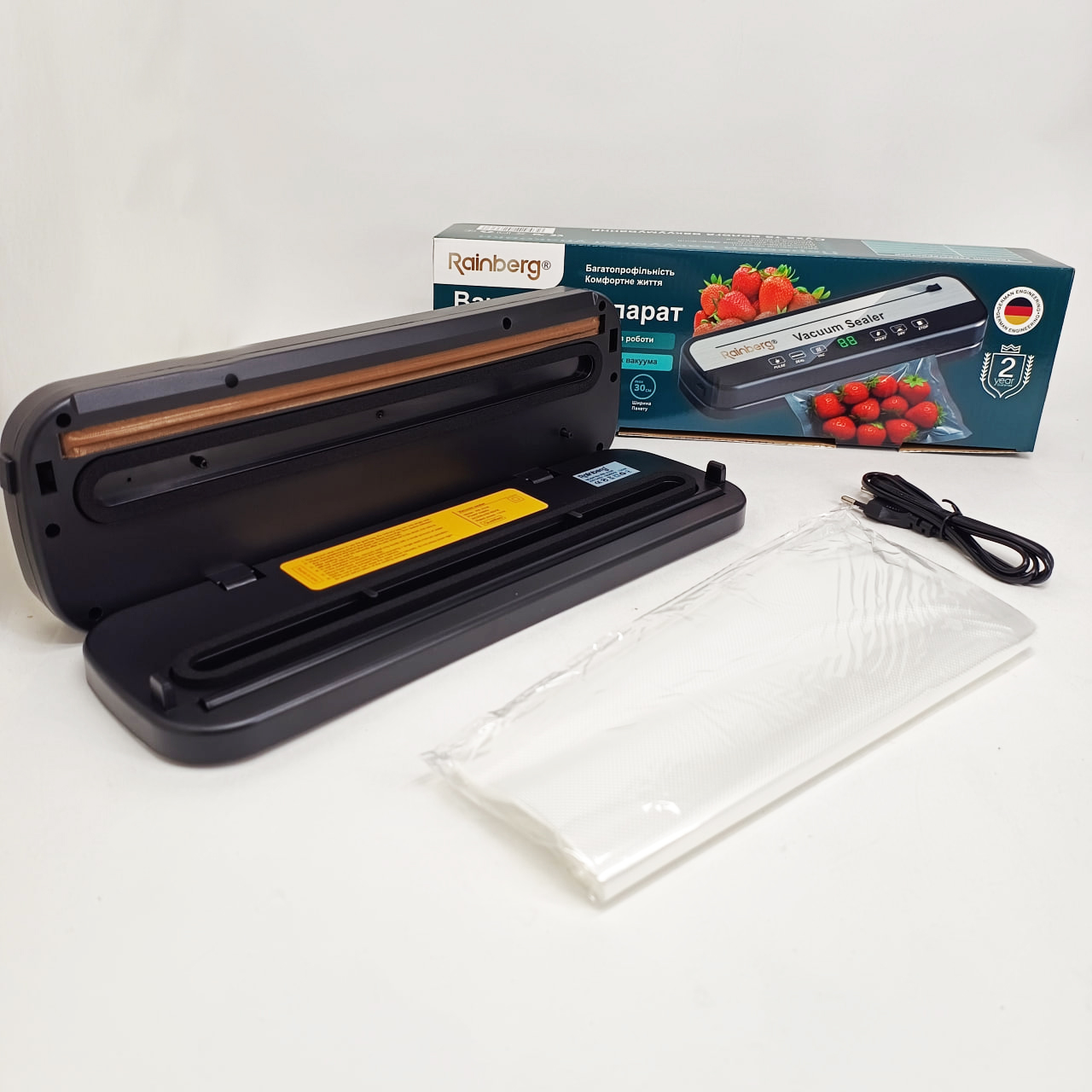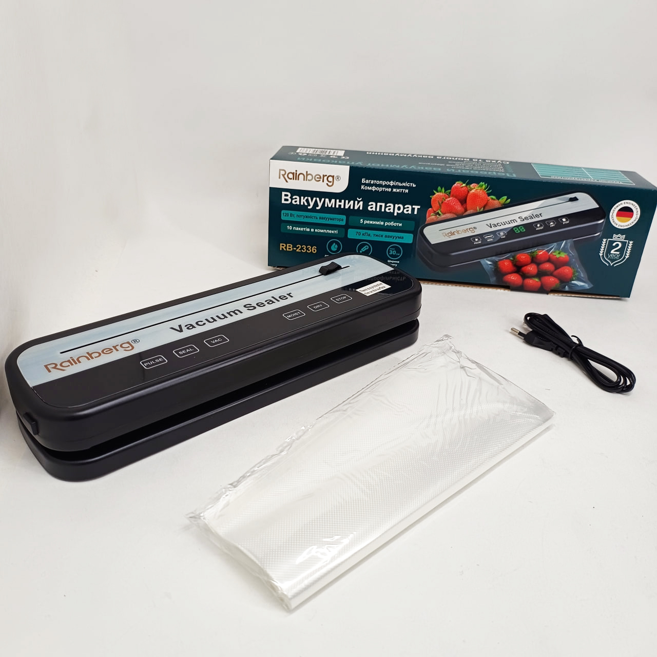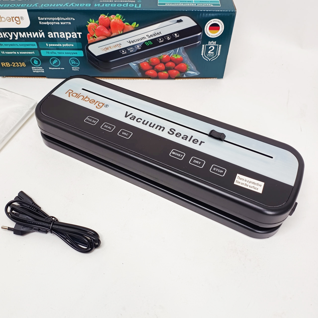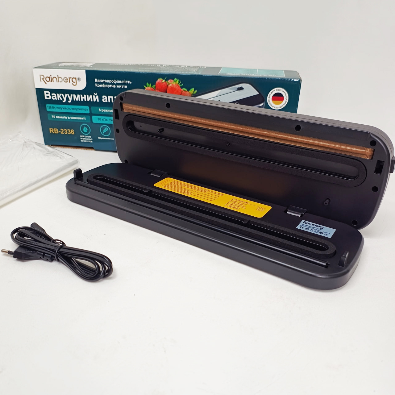 Революційний вакууматор Rainberg – ваш найнадійніший помічник для тривалого збереження свіжості продуктів у домашніх умовах або невеликому комерційному просторі. Завдяки інноваційній бескамерній технології, цей прилад забезпечує якісне видалення повітря з пакета і надійне герметичне запаювання. Ви збережете смак, аромат і корисні властивості улюблених продуктів в кілька разів довше, що оптимізує домашній бюджет і зберігає час на щоденні походи до магазину.