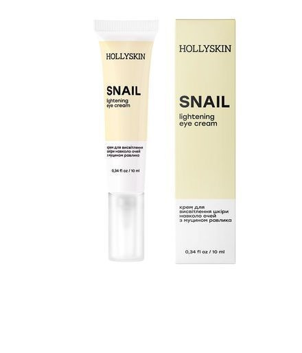 Крем для шкіри навколо очей Hollyskin Snail з муцином равлика та олією ши Hollyskin Snail Eye Cream — зволожуючий крем для делікатної зони навколо очей, який забезпечує інтенсивне відновлення, живлення та зміцнення шкіри. Муцин равлика допомагає зменшити прояви темних кіл і набряклості, робить погляд більш свіжим і відпочилим. Формула м’яко пом’якшує шкіру, підтримує її еластичність і комфорт протягом дня. Основні властивості крему Hollyskin Snail Як працює:інтенсивно зволожує й допомагає утримувати вологу; зменшує видимість темних кіл та набряклості; підтримує гладкість і пружність шкіри; сприяє відновленню та зміцненню делікатної зони; пом’якшує шкіру та дарує відчуття комфорту.Активні компоненти Як діють активи засобу:муцин равлика — стимулює оновлення, підвищує пружність і сприяє зменшенню сухості; олія ши — живить, пом’якшує, збагачує вітамінами та зміцнює захисний бар’єр; сквалан — відновлює ліпідний баланс, зменшує втрату вологи, підвищує еластичність; гіалуронова кислота — притягує та утримує вологу у верхніх шарах шкіри; вітамін Е — захищає від передчасного старіння та підтримує гладкість.Кому підходить Цей засіб ідеальний для:сухої та комбінованої шкіри повік; схильної до сухості та дрібних зморшок; шкіри з ознаками втоми та тьмяності; щоденного ранкового й вечірнього догляду.Ефект від використання крему Hollyskin Snailбільш гладка, зволожена й пружна шкіра; менша помітність темних кіл і набряклості; відчутний комфорт без сухості й стягнення; більш свіжий, відпочилий та розслаблений погляд.Спосіб використання, об’єм та форма випуску Нанесіть невелику кількість крему на очищену шкіру навколо очей і розподіліть легкими постукуючими рухами кінчиків пальців. Підходить для щоденного застосування. Тип шкіри: суха, комбінована. Форма випуску: крем для шкіри навколо очей. Об’єм: 10 мл, .тюбик