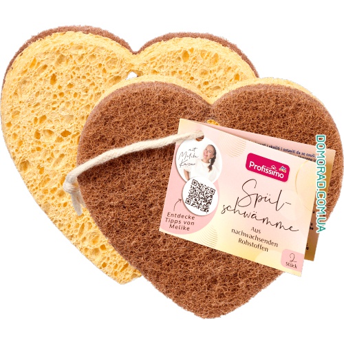З губками для миття посуду Profissimo у формі серця миття посуду стає маленькою радістю у повсякденному житті. Чарівна форма серця не лише візуально привертає увагу на будь-якій кухні, але й зручна в руці. Вони дозволяють легко та ретельно мити посуд і поверхні. Поєднуючи функціональність із привабливим дизайном, вони додають нотку різноманітності у ваш розпорядок дня. Губка має дві сторони: абразивна сторона з кокосовим волокном справляється зі стійким брудом, а м’яка, абсорбуюча сторона з целюлозою є дуже ефективною. Вона також має зручну петлю для підвішування. Вперед весняне прибирання!