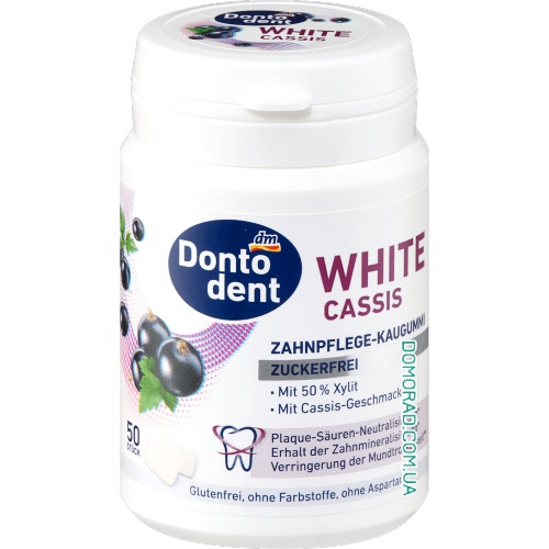 Жувальна гумка Dontodent White Cassis з ксилітом пропонує фруктовий смак чорної смородини та відчуття чистоти. Не містить цукру, тому сприяє підтримці мінералізації зубів. Жування після їжі або пиття також допомагає нейтралізувати зубний наліт. Жувальна гумка також допомагає зменшити сухість у роті. Формула з 50% ксилітолу є веганською, не містить глютену та штучних барвників, а також аспартаму. Ідеальний супутник для догляду за зубами в дорозі, для відчуття чистоти у роті.