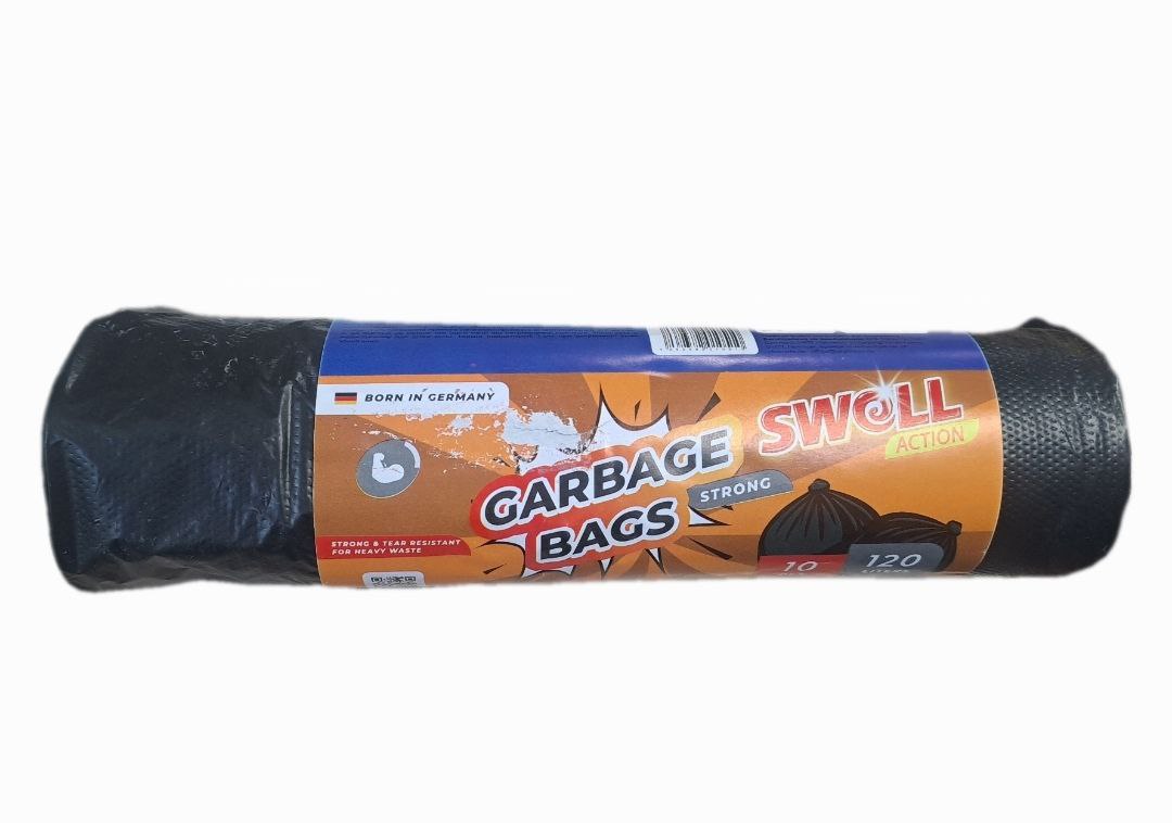 Пакети для сміття Swell, 120 л, 10 шт — міцні та місткі пакети, призначені для зручного збору та утилізації великої кількості побутових відходів. Завдяки щільному поліетиленовому матеріалу вони добре витримують вагу сміття та допомагають підтримувати чистоту в домі, офісі чи на виробництві.