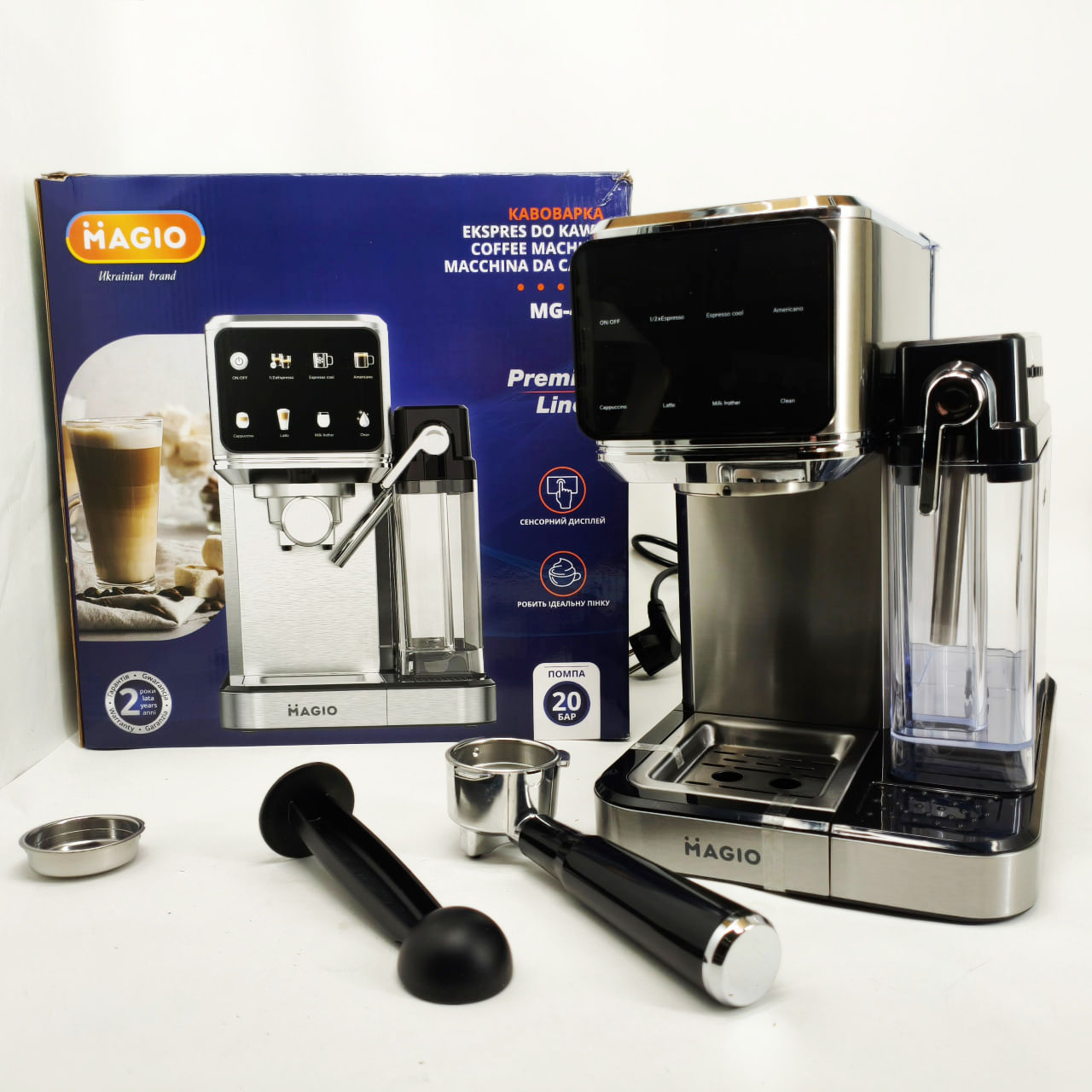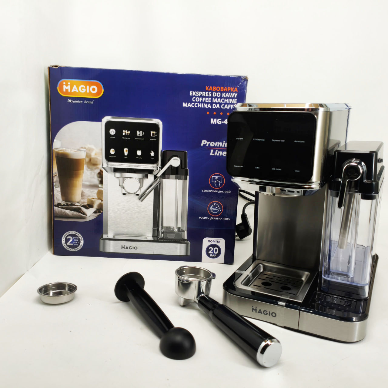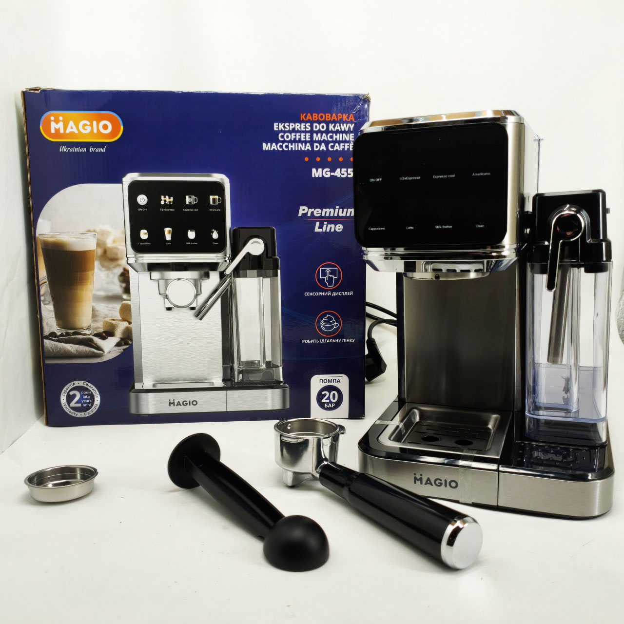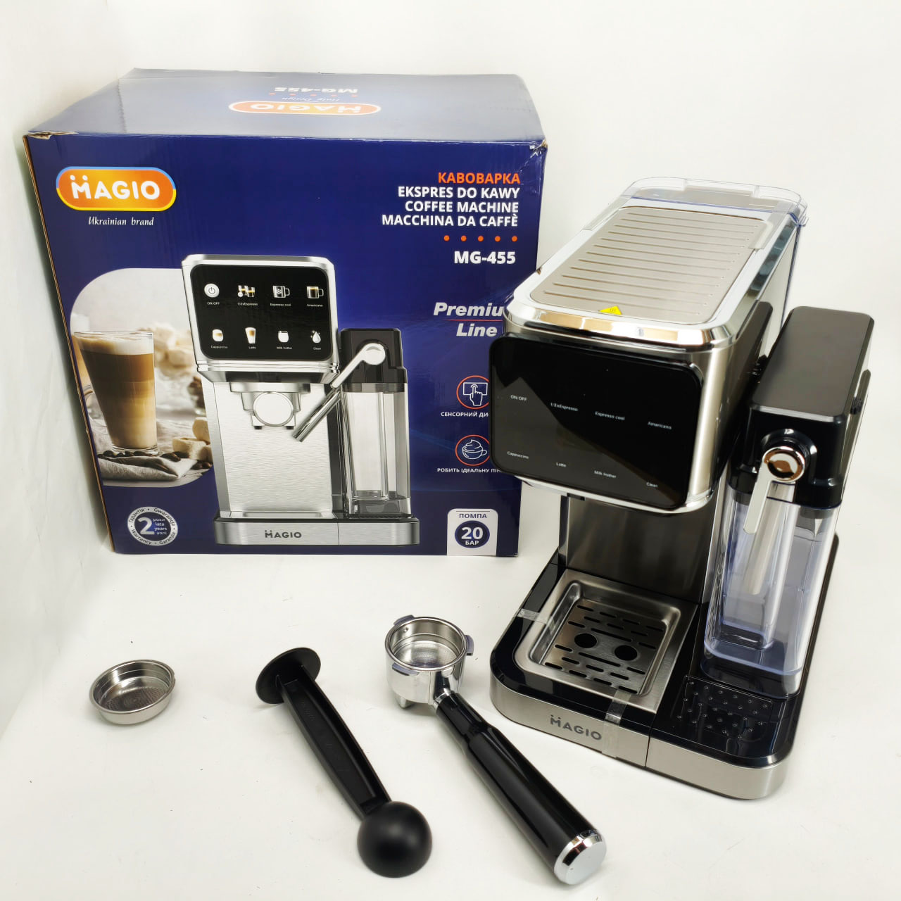 Magio MG-455 — це рожкова кавоварка, спеціально створена для щоденного приготування ароматних і насичених кавових напоїв. З тиском 20 бар пристрій забезпечує отримання густої кремової піни та яскраво вираженого смаку еспресо. Зручне сенсорне керування та автоматичний режим приготування молочних напоїв роблять процес створення капучіно і латте швидким і легким.