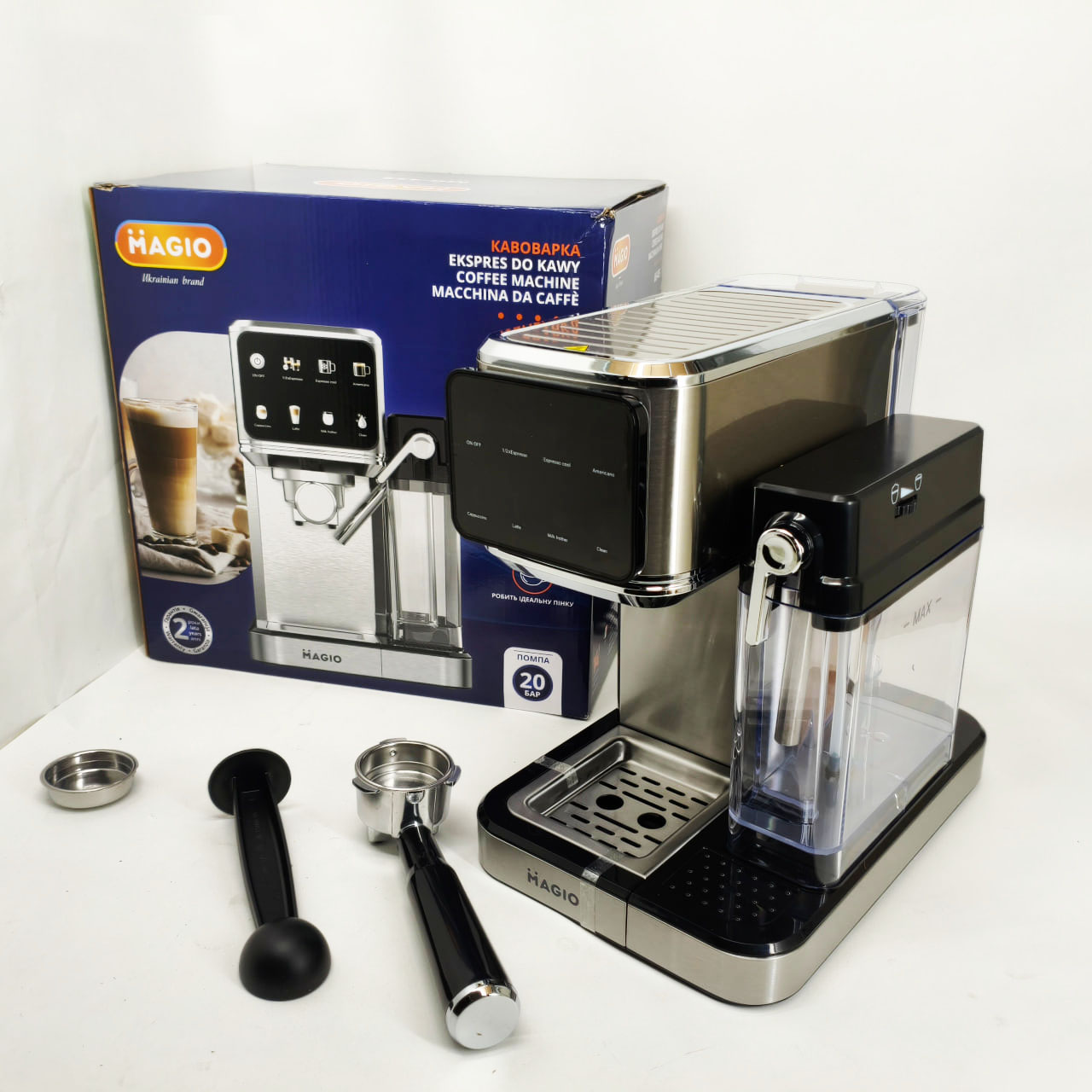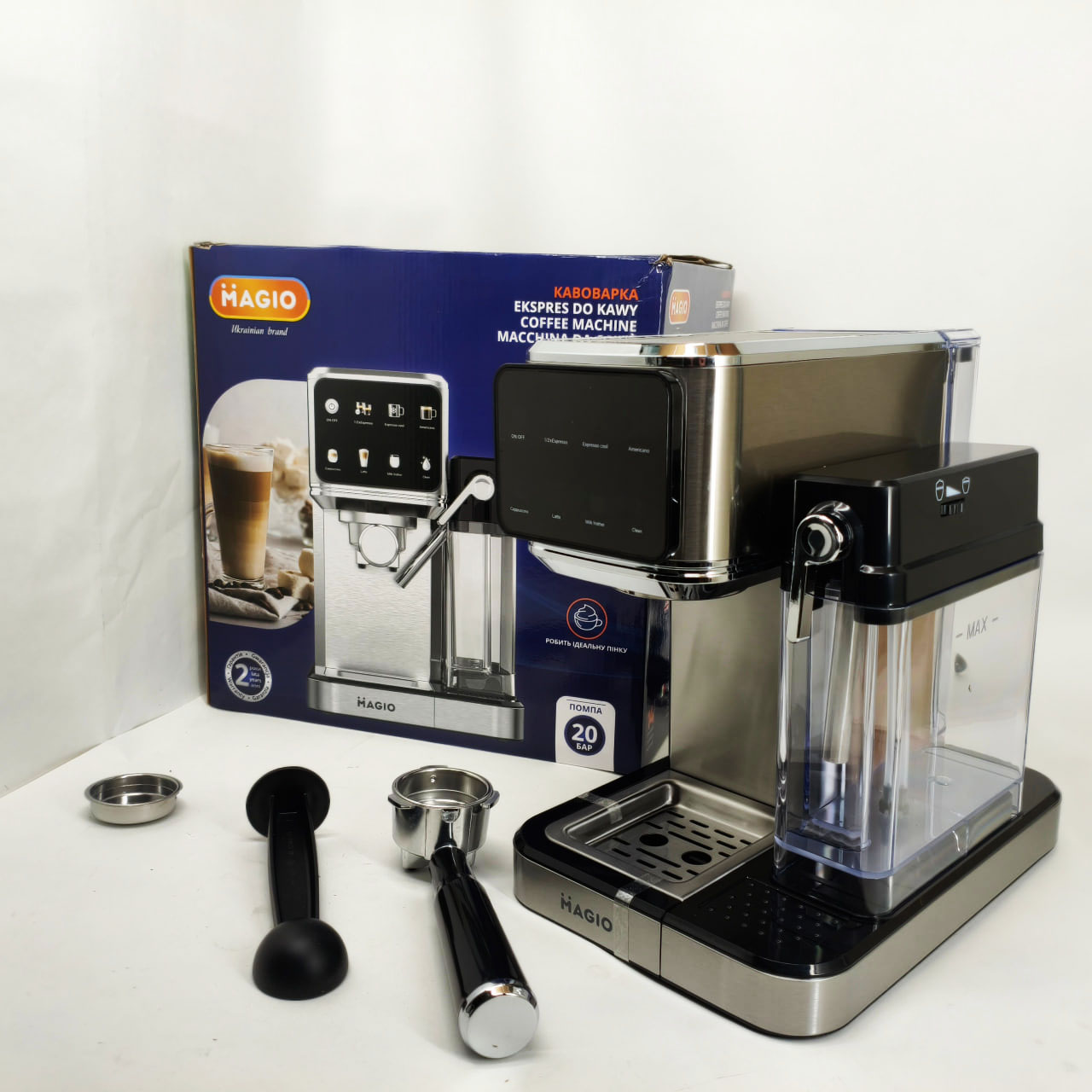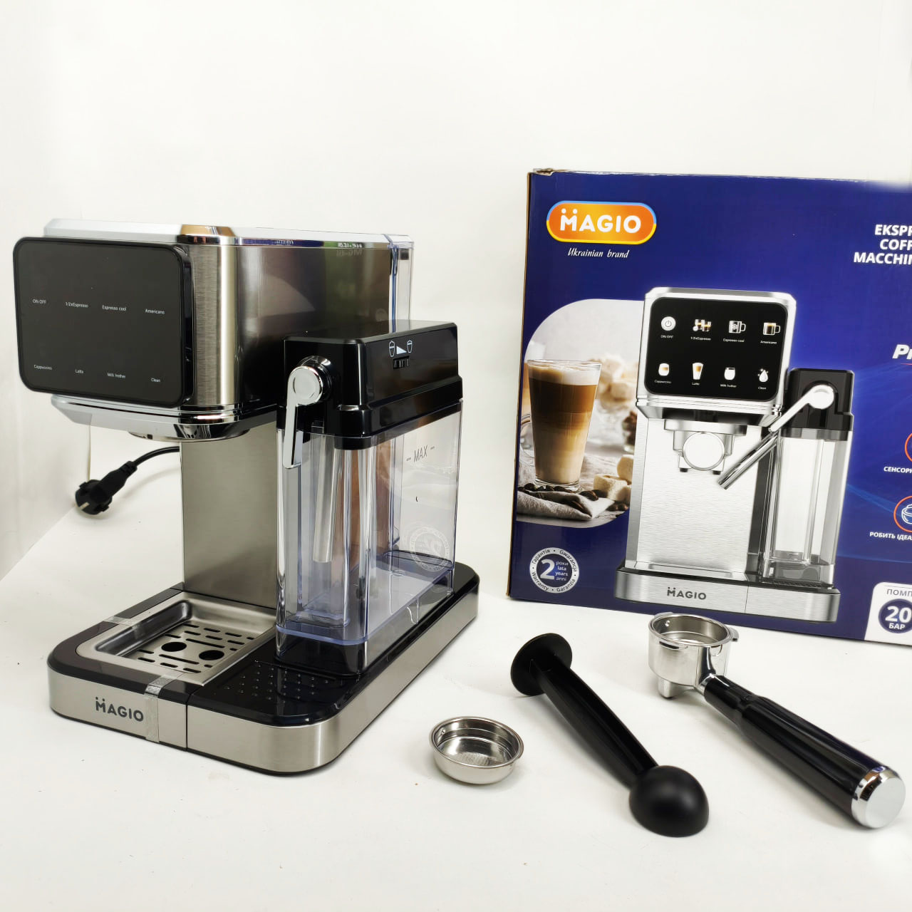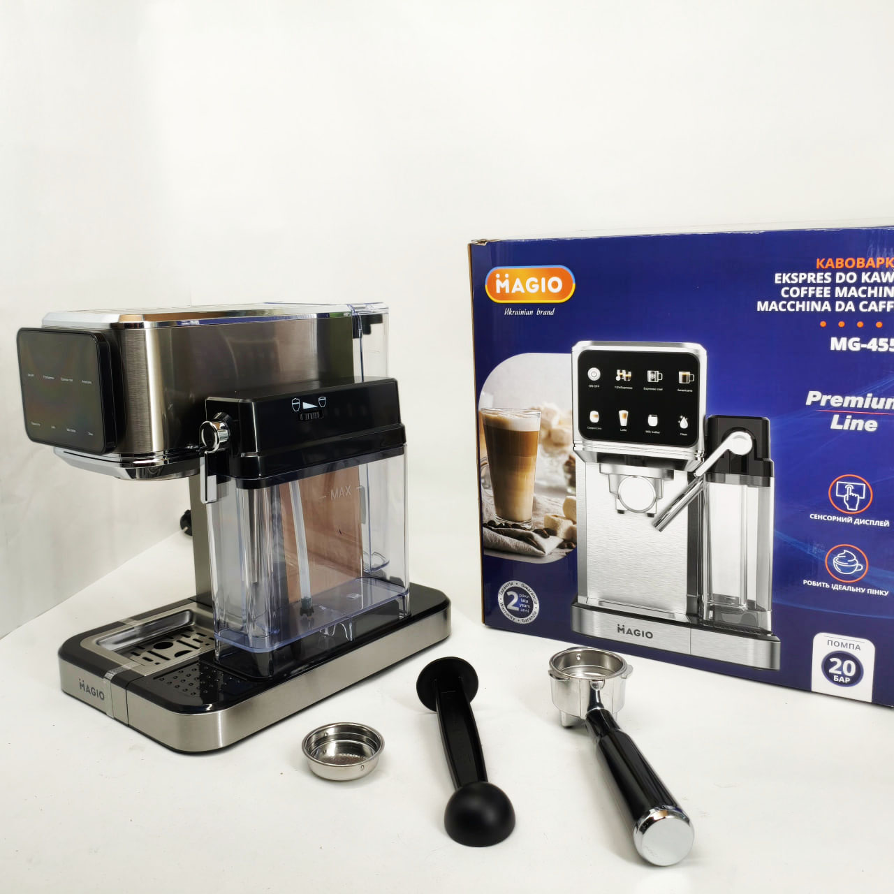 Magio MG-455 — це рожкова кавоварка, спеціально створена для щоденного приготування ароматних і насичених кавових напоїв. З тиском 20 бар пристрій забезпечує отримання густої кремової піни та яскраво вираженого смаку еспресо. Зручне сенсорне керування та автоматичний режим приготування молочних напоїв роблять процес створення капучіно і латте швидким і легким.