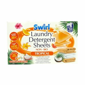 Swirl Листи прального порошку універсальні "Тропічний", 20 шт. — це інноваційне рішення для зручного, ефективного та гігієнічного прання. Кожен аркуш містить точно дозовану кількість мийного засобу, що легко розчиняється у воді та підходить для всіх типів тканин і кольорів. Засіб підходить для прання в пральній машині або вручну, у холодній та гарячій воді. Після прання білизна залишається чистою, м’якою та з делікатним ароматом свіжості. Компактна упаковка містить 20 листів, що ідеально підходить як для дому, так і для подорожей.