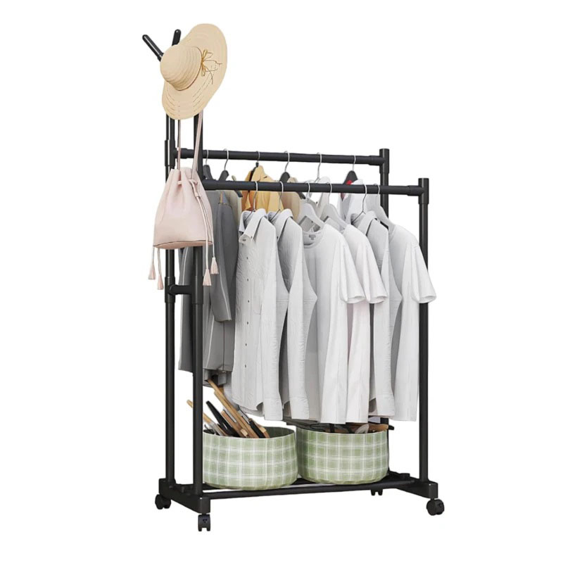 Сталева подвійна стійка для одягу та взуття на коліщатках чорна