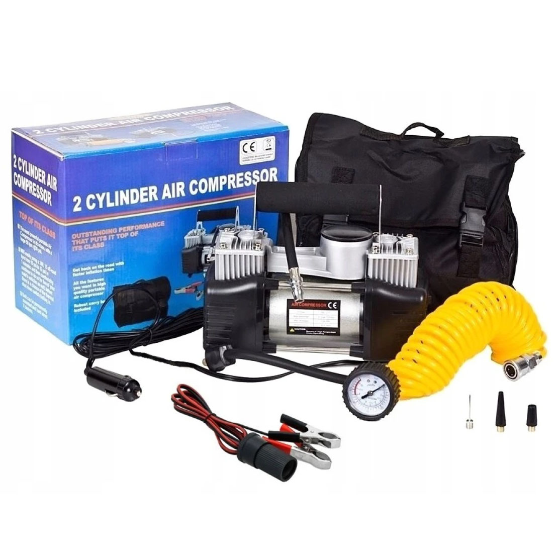 Автомобільний компресор двопоршневий 12V з манометром та насадками