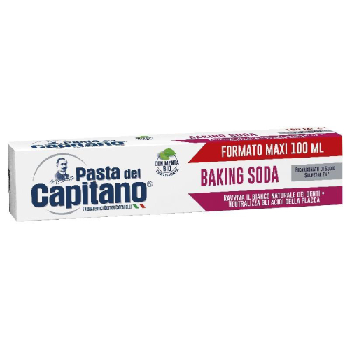 Відбілююча зубна паста Pasta del Capitano Baking Soda допомагає відновити природну білизну зубів. 100% італійський продукт із натуральних інгредієнтів. Завдяки вмісту бікарбонату натрію та фтору, зубна паста Pasta del Capitano Baking Soda гарантує делікатне відбілювання. Формула пасти, що містить сульфетальний цинк, гарантує повну гігієну ротової порожнини завдяки антибактеріальній дії цинку. А також нейтралізує бактеріальні кислоти зубного нальоту, забезпечуючи ефективний захист ротової порожнини.