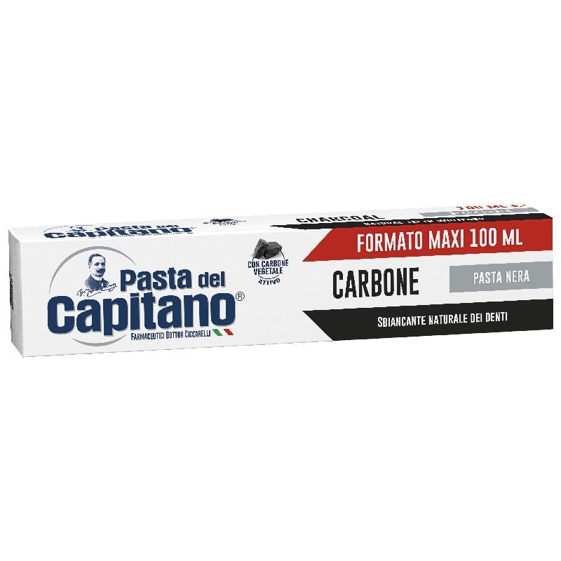 Натуральний вибільник в чорній пасті. Формула нової зубної пасти Pasta del Capitano з Деревним Вугіллям як Активний компонент чинить вибілювальну дію, запобігає галітозу і не завдає шкоди емалі. Тестування підтвердило поступове повернення зубам їх природної білини та ефективний вплив вугілля на потемніння емалі від кави, чаю й куріння