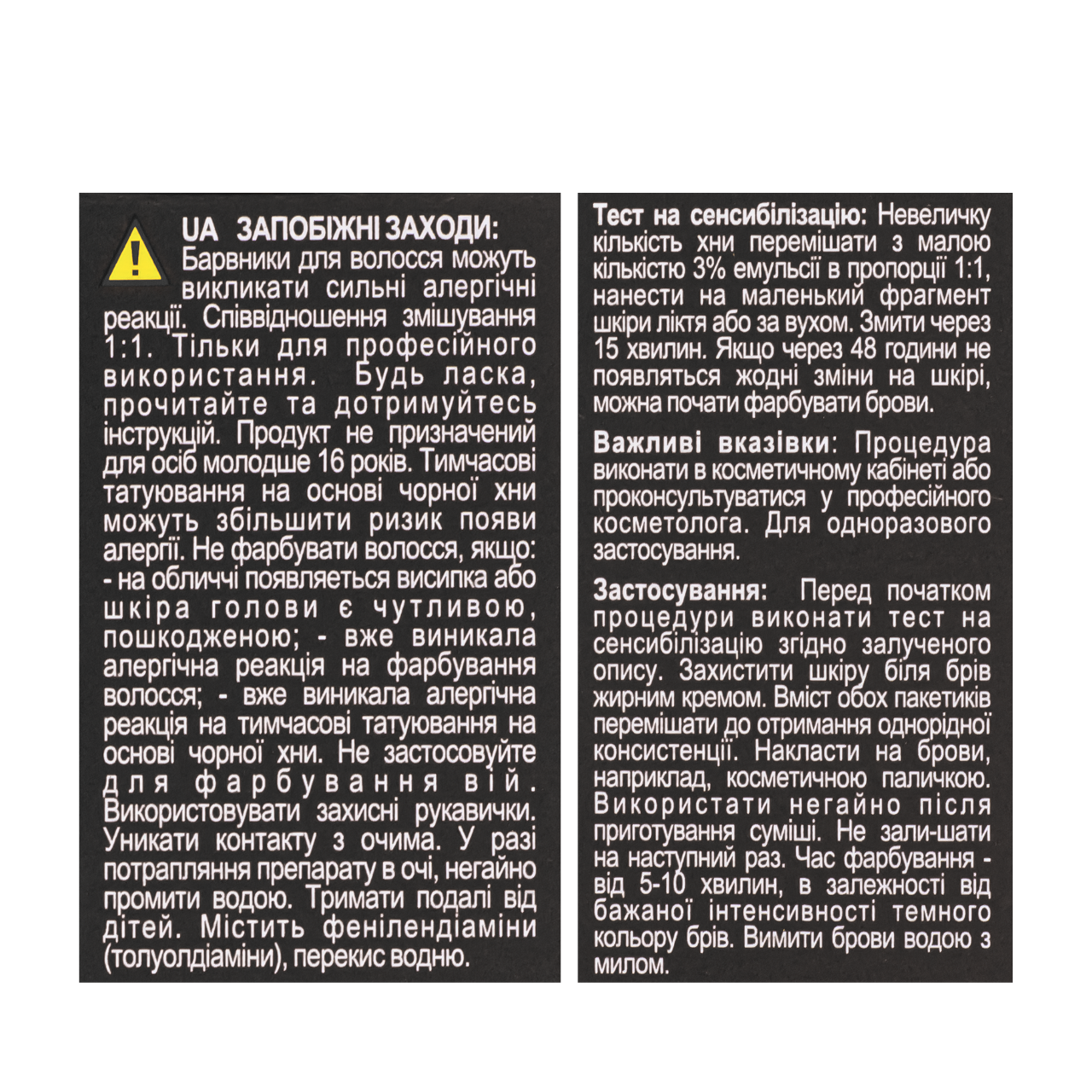 Досить змішати вміст двох пакетиків – порошок-барвник та активатор. За допомогою косметичної палички або кисті нанести на брови. Після закінчення умовленого часу змити водою, а за допомогою пінцету або воску надати бровам форму. Насиченість кольору залежить від часу дії фарби. Стійкість до 14 днів.