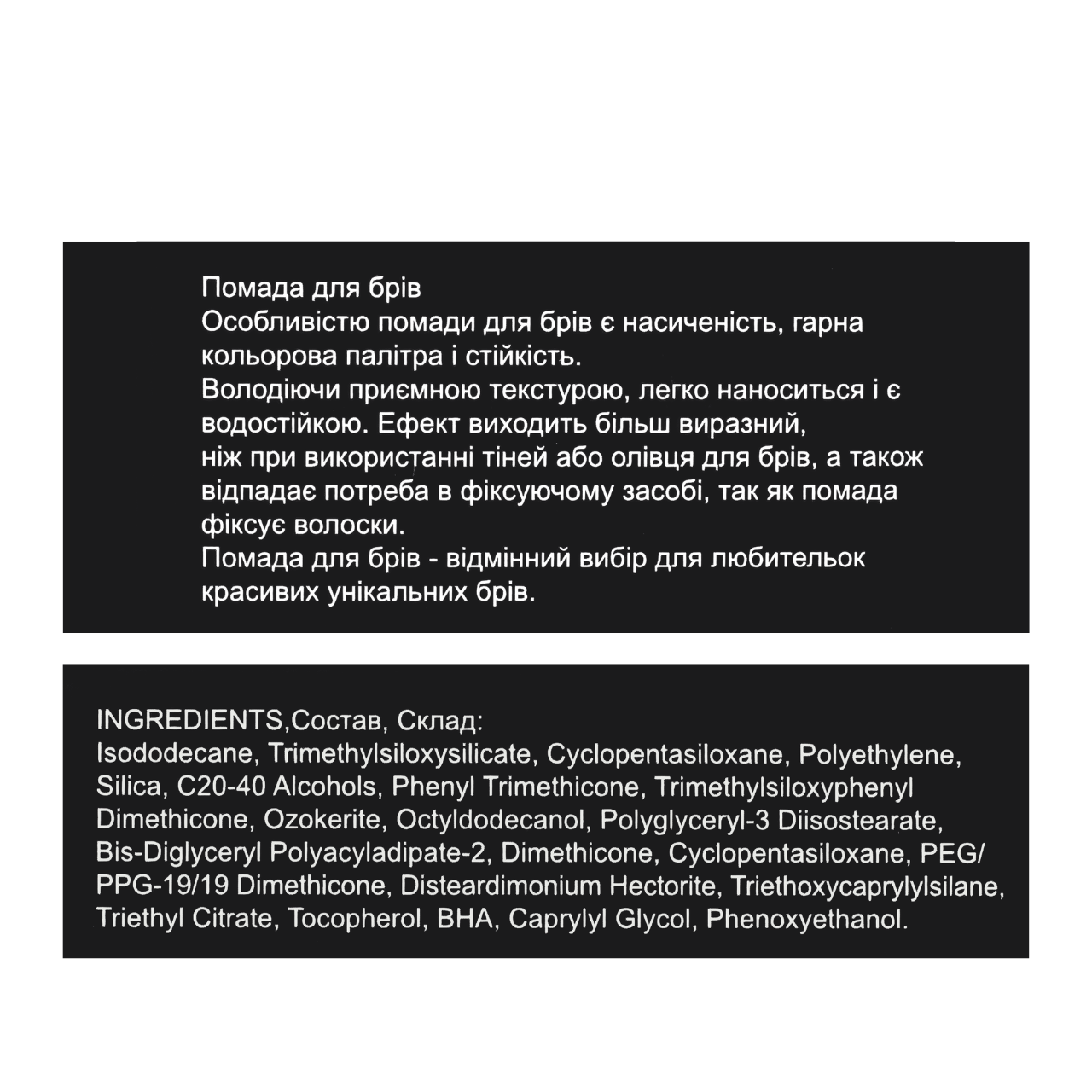 ідеально підходить для щоденного використання.Спосіб застосування: наносити декоративний засіб потрібно по лінії росту брів. Використовуйте спеціальну нейлонову щітку для фіксації, за допомогою якої можна створити стильне укладання. Для насиченішого відтінку можна наносити продукт у 2-3 шари.Вага – 2,5 г.