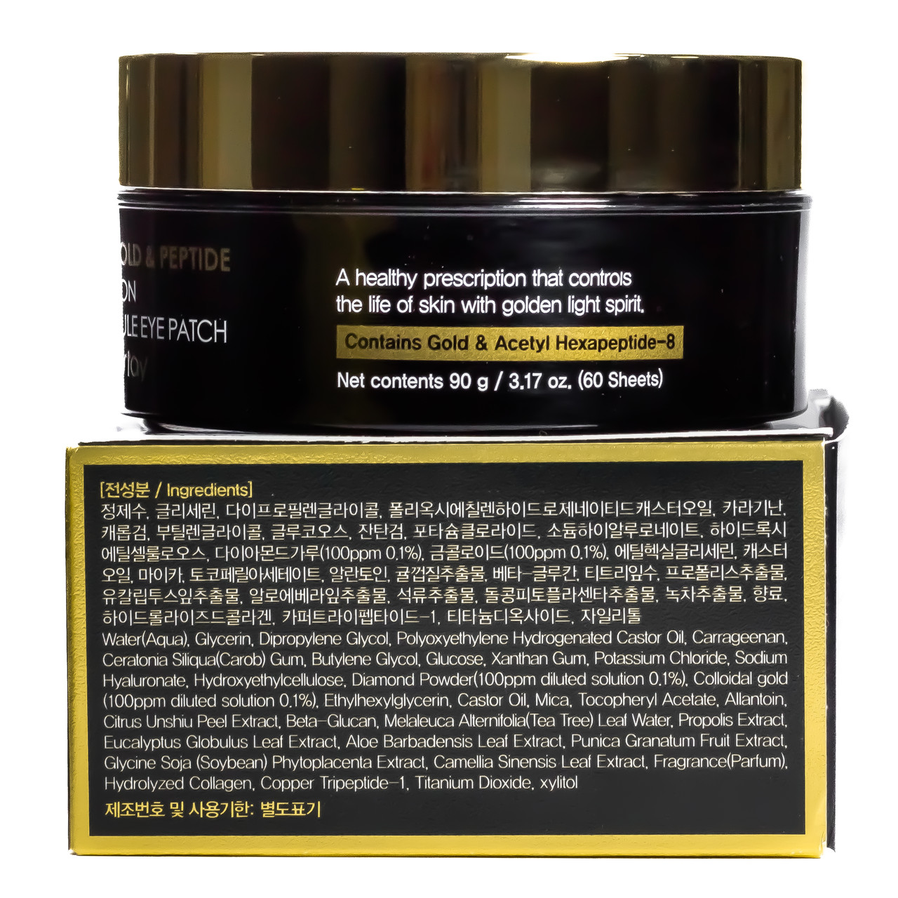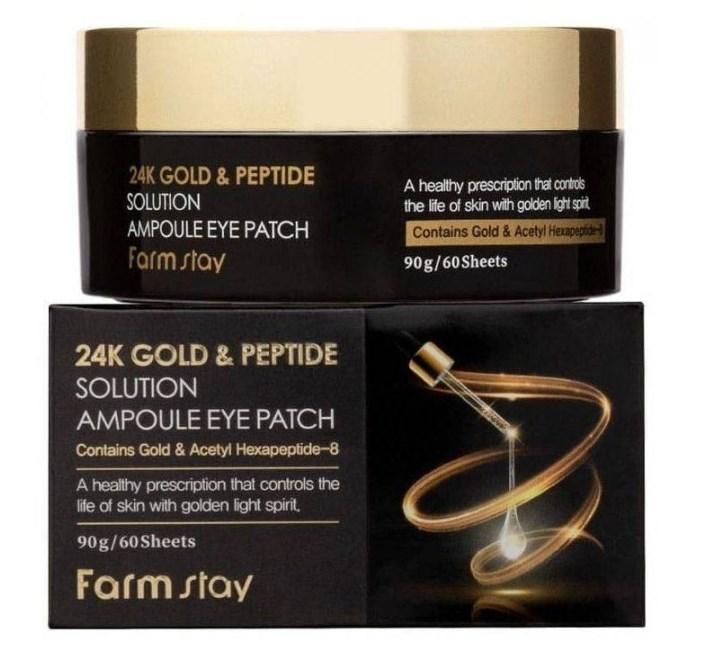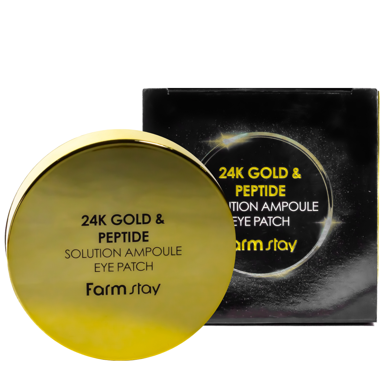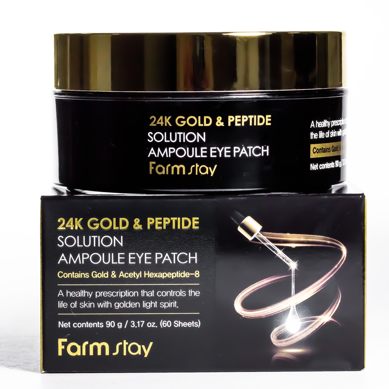Антивікові гідрогелеві патчі з пептидним комплексом і золотом FarmStay 24K Gold & Peptide Solution Ampoule Eye Patch Патчі для шкіри навколо очей FarmStay 24K Gold & Peptide Solution Ampoule Eye Patch - унікальний засіб з антивіковим і відновлюючим ефектом. Активна формула компонентів швидко відновлює шкіру, запобігає появі зморшок, темних кіл, набряклості. Головний інгредієнт в складі - 24-каратне золото, яке відоме своїми омолоджують властивостями. Золото активізує природну регенерацію шкіру на клітинному рівні, сприяючи зникненню мімічних зморшок. Під впливом пептидного комплексу Ваша шкіра стає більш гладкою і пружною, наповнюється вологою і життєвою енергією. Зникають темні кола, сліди втоми, припухлість. Маточне молоко насичує шкіру вітамінами та поживними речовинами, завдяки чому відновлює гідробаланс і зникає сухість, стягнутість шкіри.Застосування: перед використанням патчів, очистіть шкіру обличчя. Вийміть патчі з баночки з допомогою лопатки, розташуйте під очима. По закінченню 20-30 хвилин зніміть патчі.После відкриття баночку з патчами варто зберігати на дверцятах холодильника щільно закритою.Всього в упаковці 60 патчів. Вага: 1.5x60 г
