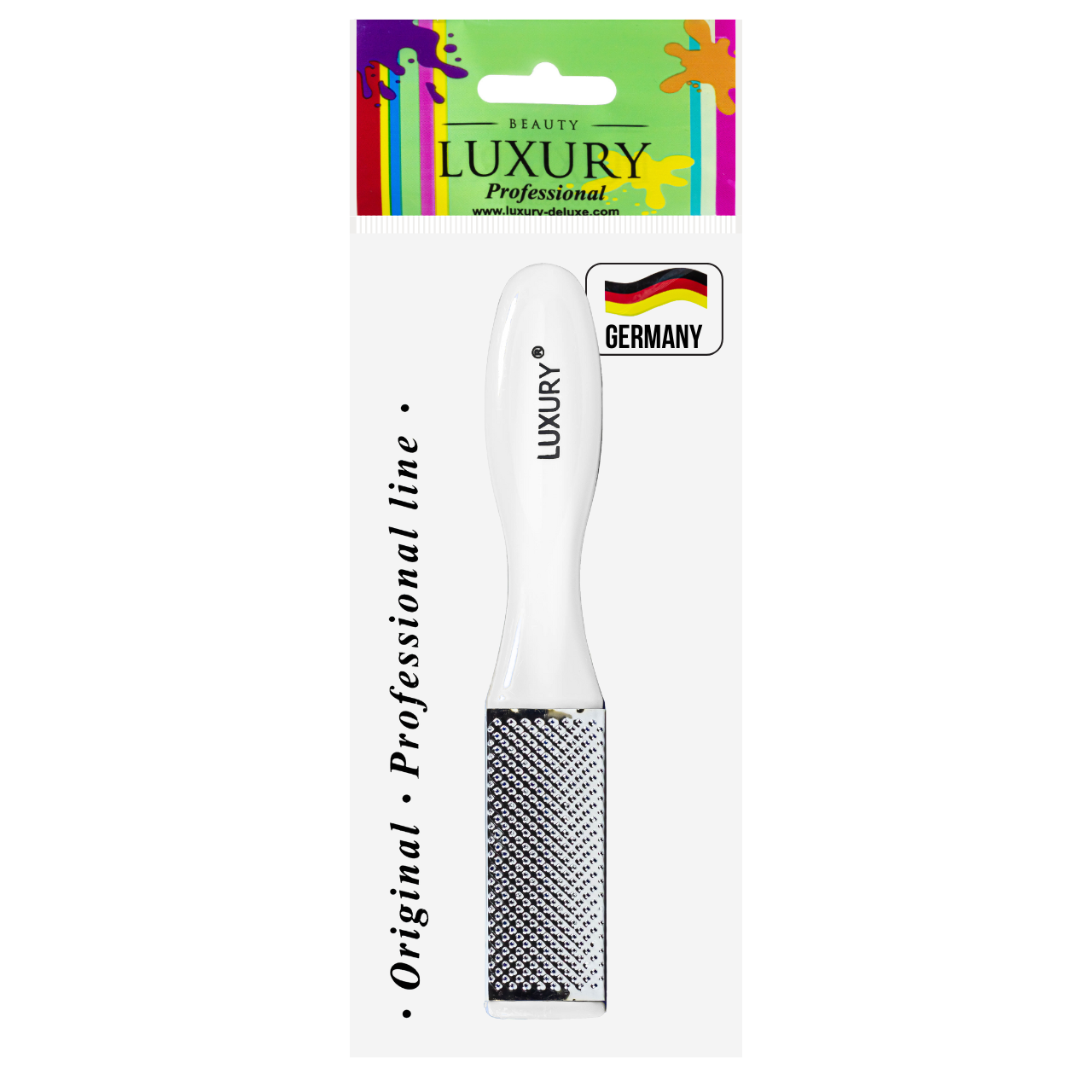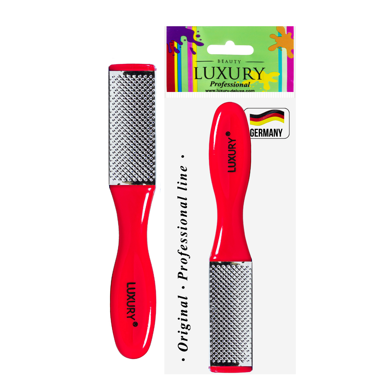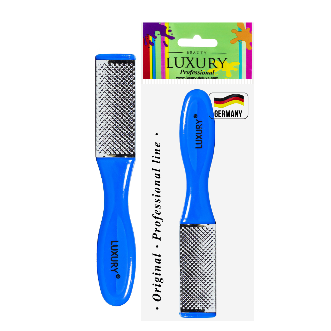 Терка для педикюру Beauty LUXURY - двостороння шліфувальна металева пилка для ніг, виготовлена з якісного пластику і металевих насадок. Інструмент призначений для видалення натоптишів, мозолів, а також для інших стандартних процедур в педикюрі. Кожна зі сторін педикюру терки має іншу абразивность. Грубіша сторона найчастіше використовується для роботи з натоптишами, м'якша же використовується для шліфування. Завдяки зручній пластікоквій прозорій ручці, робота з такою пилою не складає труднощів, її можна легко піддавати миттю та дезінфекції.