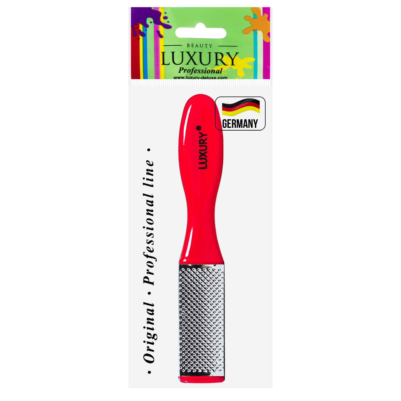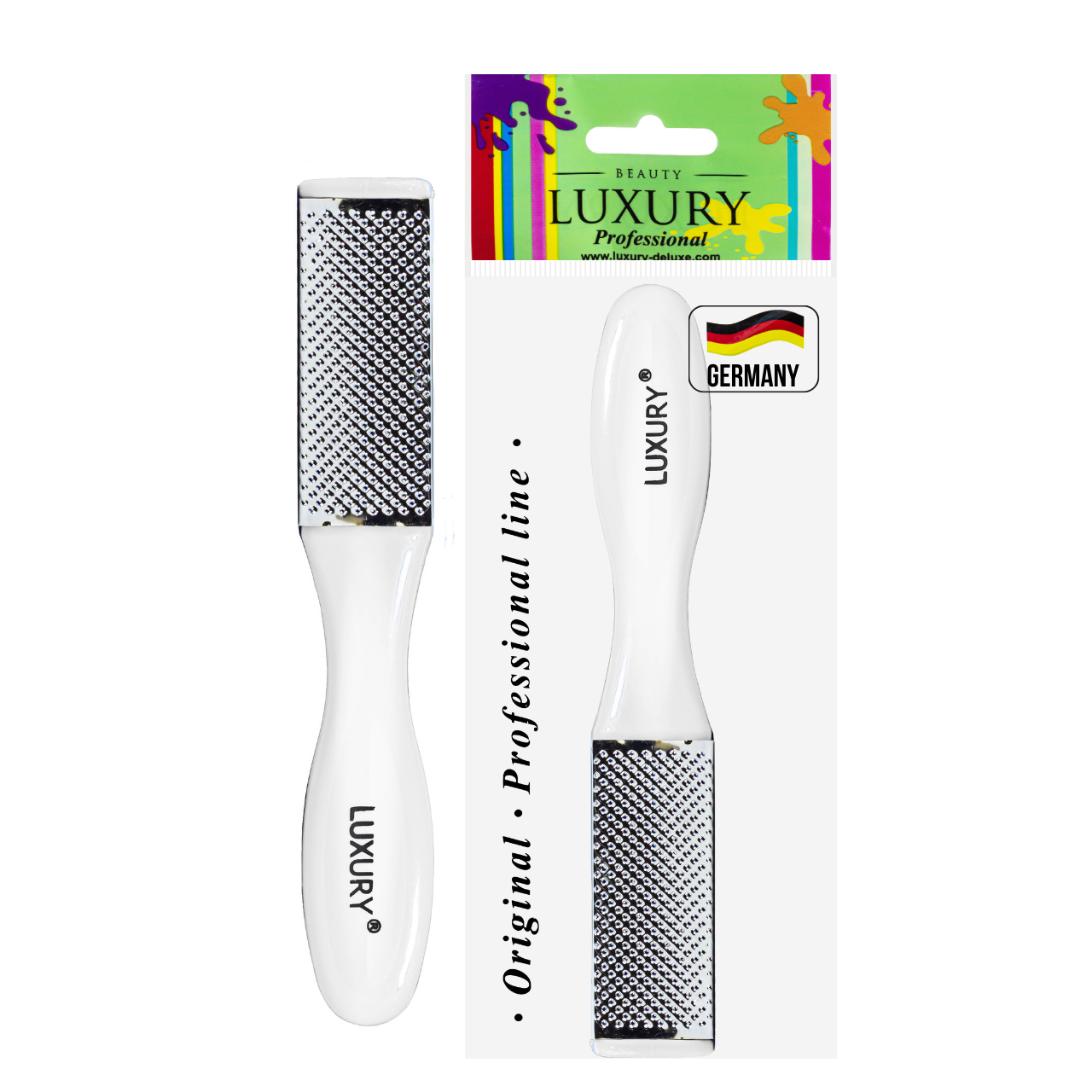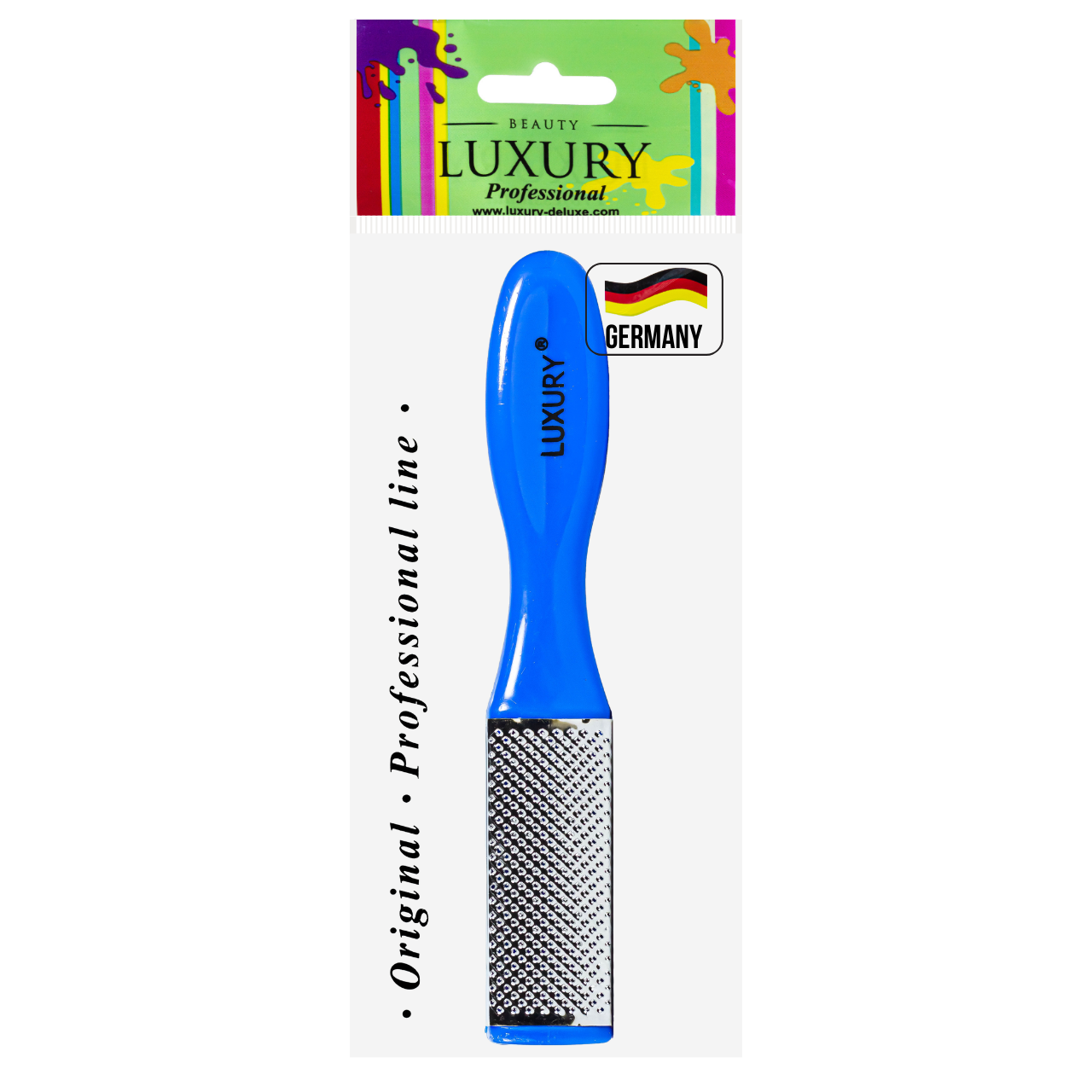 Терка для педикюру Beauty LUXURY - двостороння шліфувальна металева пилка для ніг, виготовлена з якісного пластику і металевих насадок. Інструмент призначений для видалення натоптишів, мозолів, а також для інших стандартних процедур в педикюрі. Кожна зі сторін педикюру терки має іншу абразивность. Грубіша сторона найчастіше використовується для роботи з натоптишами, м'якша же використовується для шліфування. Завдяки зручній пластікоквій прозорій ручці, робота з такою пилою не складає труднощів, її можна легко піддавати миттю та дезінфекції.