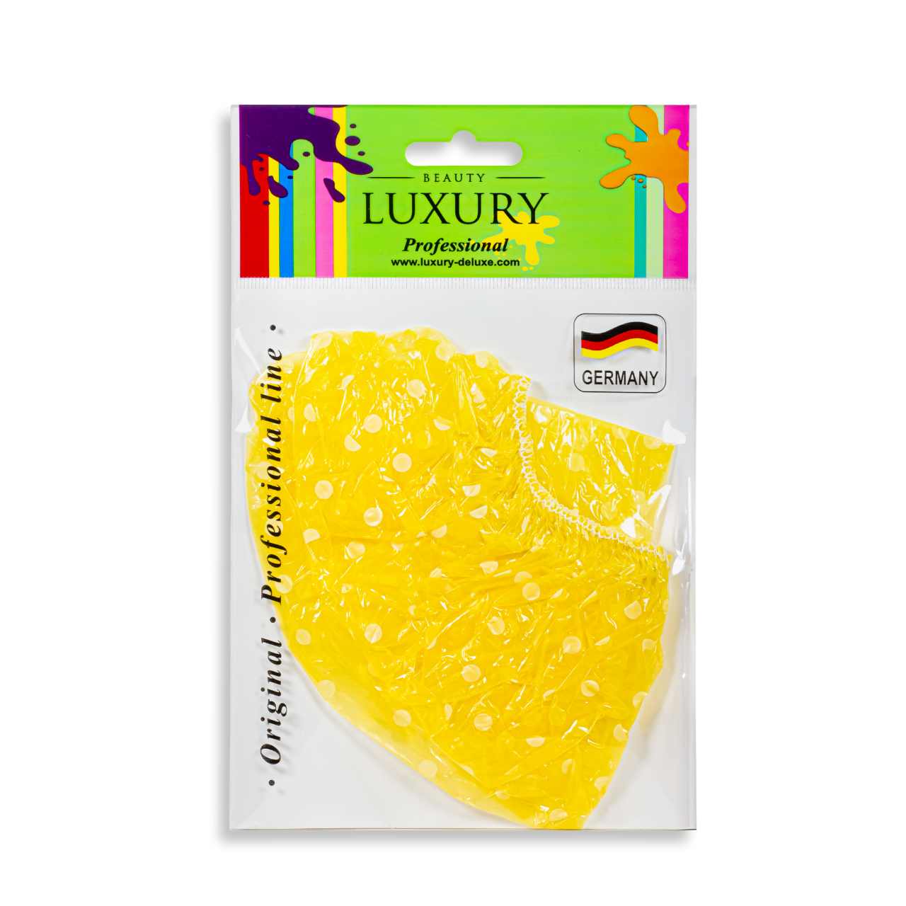 Шапочка Beauty LUXURY дозволяє прийняти душ, зберігши красиве укладання незмінною, а волосся сухими. Вона утримується на голові за допомогою щільної резиночки, яка досить еластична, щоб не здавлювати і не натирати шкіру.Шапочка для душа виготовлена з кольорового поліетилену в білий горошок.