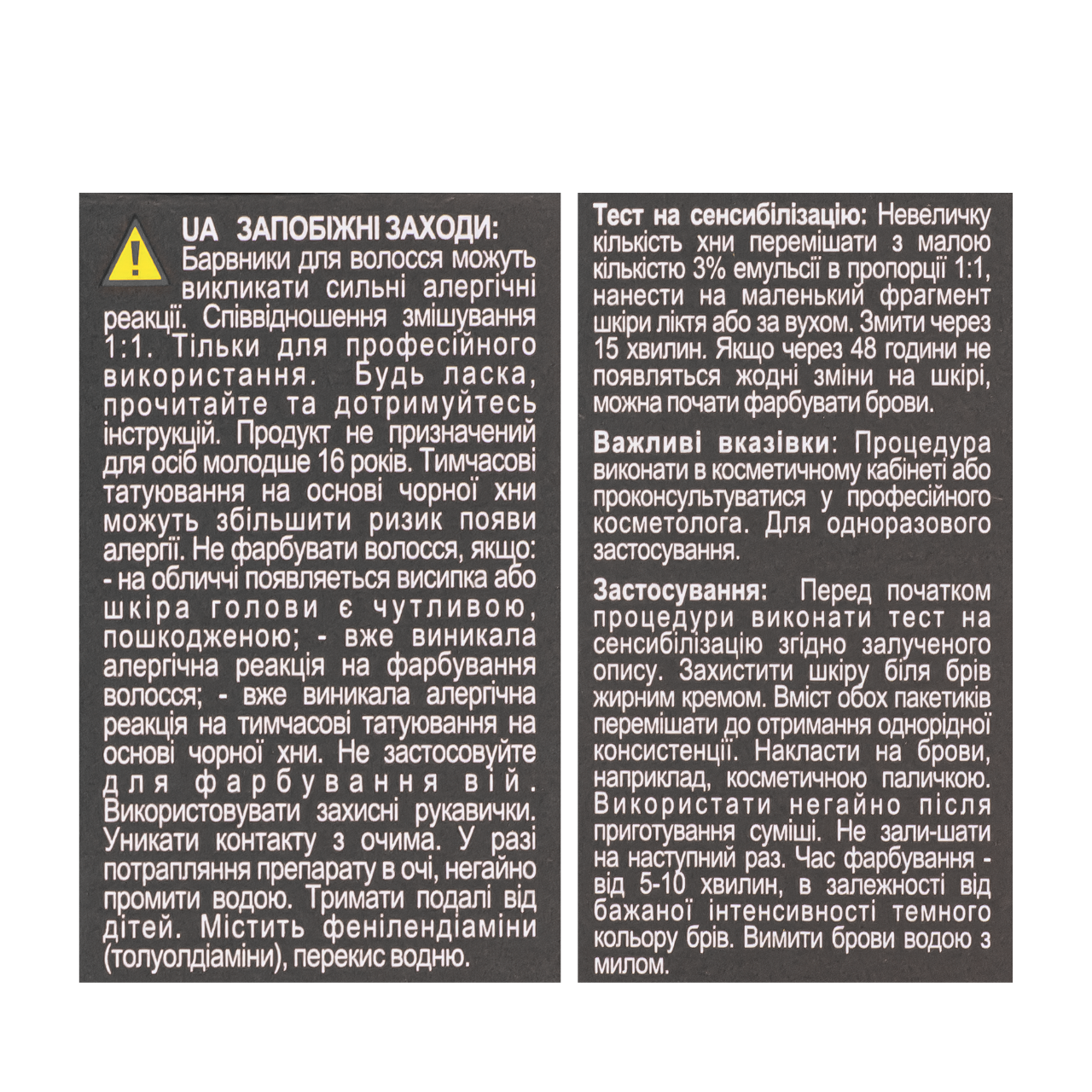Досить змішати вміст двох пакетиків – порошок-барвник та активатор. За допомогою косметичної палички або кисті нанести на брови. Після закінчення умовленого часу змити водою, а за допомогою пінцету або воску надати бровам форму. Насиченість кольору залежить від часу дії фарби. Стійкість до 14 днів.