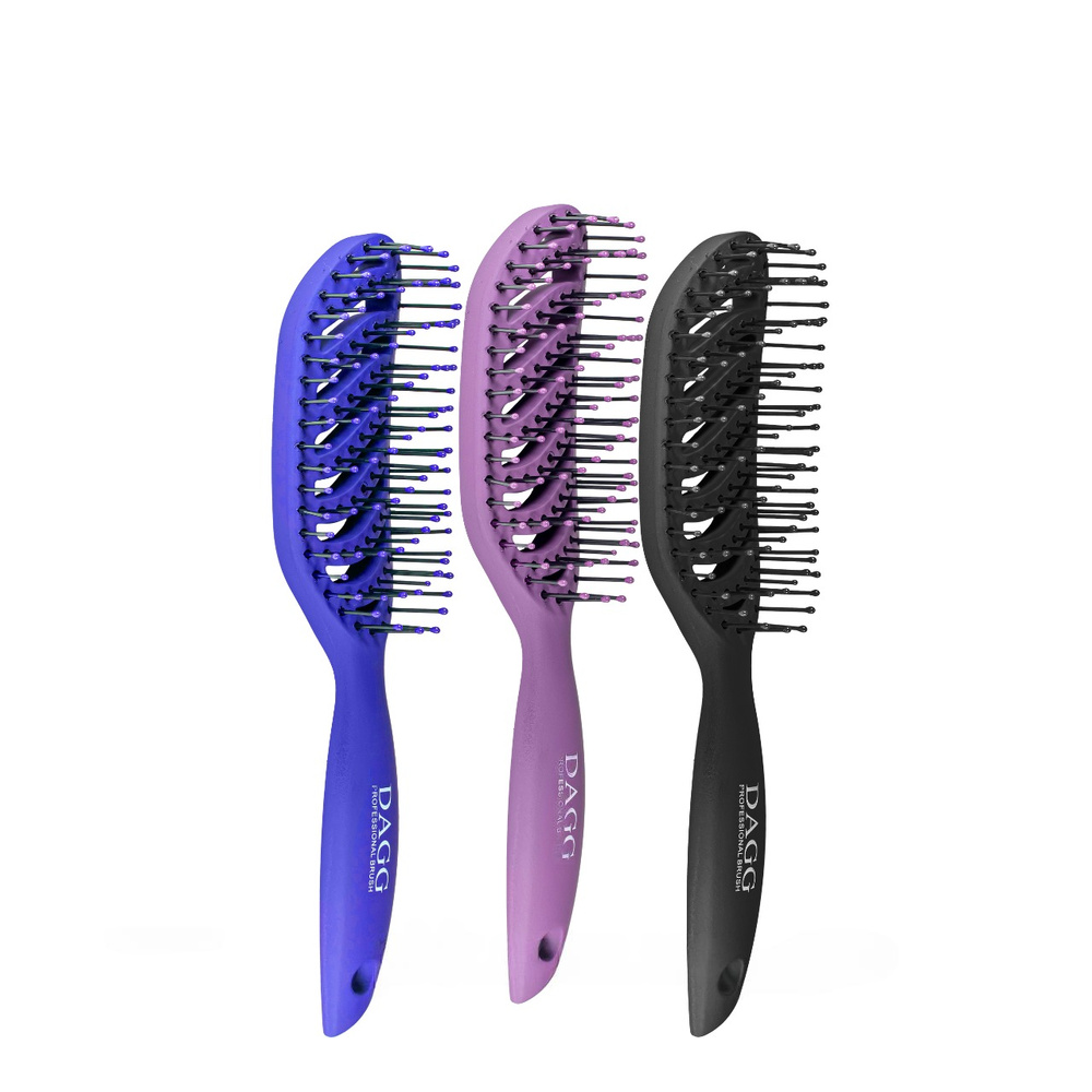 Щітка для волосся DAGG 5035 має пластикову цільну основу й отвори, які пропускають повітряні потоки, завдяки чому процедура укладання стає максимально комфортною і швидкою. Пластикові голки щітки з головками масажують шкіру голови. Форма щітки овальна, вигнута.