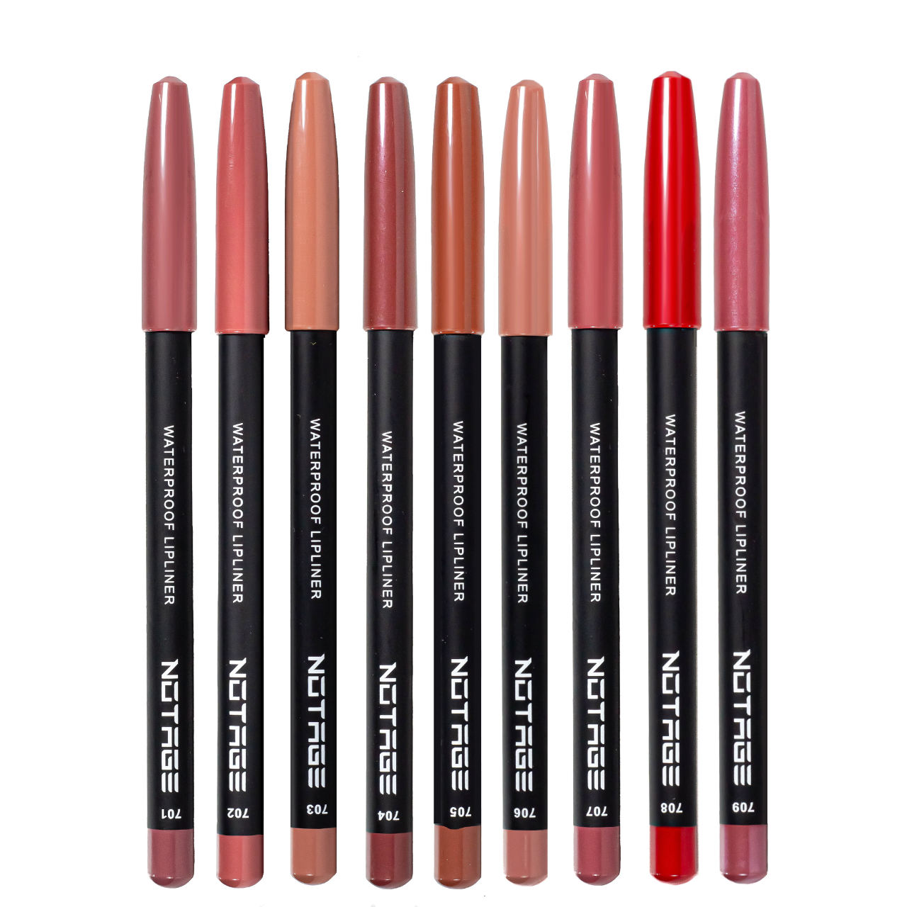 Косметичний олівець для губ Notage Waterproof lip linerКонтурний олівець для губ Notage відрізняється високою водостійкістю. Він володіє м'якою кремоподібною текстурою, яка, попри свою делікатність, не розтікається за межі окреслених вами контурів. Контурний олівець дерев'яний легко заточується. Олівець для губ використовується, щоб зробити контур чіткішим. Але ще він продовжує стійкість помади, захищаючи її від розтікання. Завдяки олівцю макіяж губ виглядає більш акуратним. Також з його допомогою можна легко скорегувати форму губ, додати їм об'єм або навпаки, зробити їх вущими.Спосіб застосування: важливо пам'ятати що олівець потрібно вибирати або в колір губ, або в колір помади, інших варіантів не існує! Для досягнення натурального ефекту лінію олівця обов'язково потрібно розтушувати. Якщо ви хочете підсилити колір помади, тоді відтінок олівця повинен бути темнішим. Обов'язково потрібно не тільки обвести їм контур, але і заштрихувати всю поверхню губ, а потім покрити помадою - її колір буде посилений, а результат буде більш стійким.Палітра має всього 9 номерів 701-709 (номера та наявність уВага: 1,14 гр