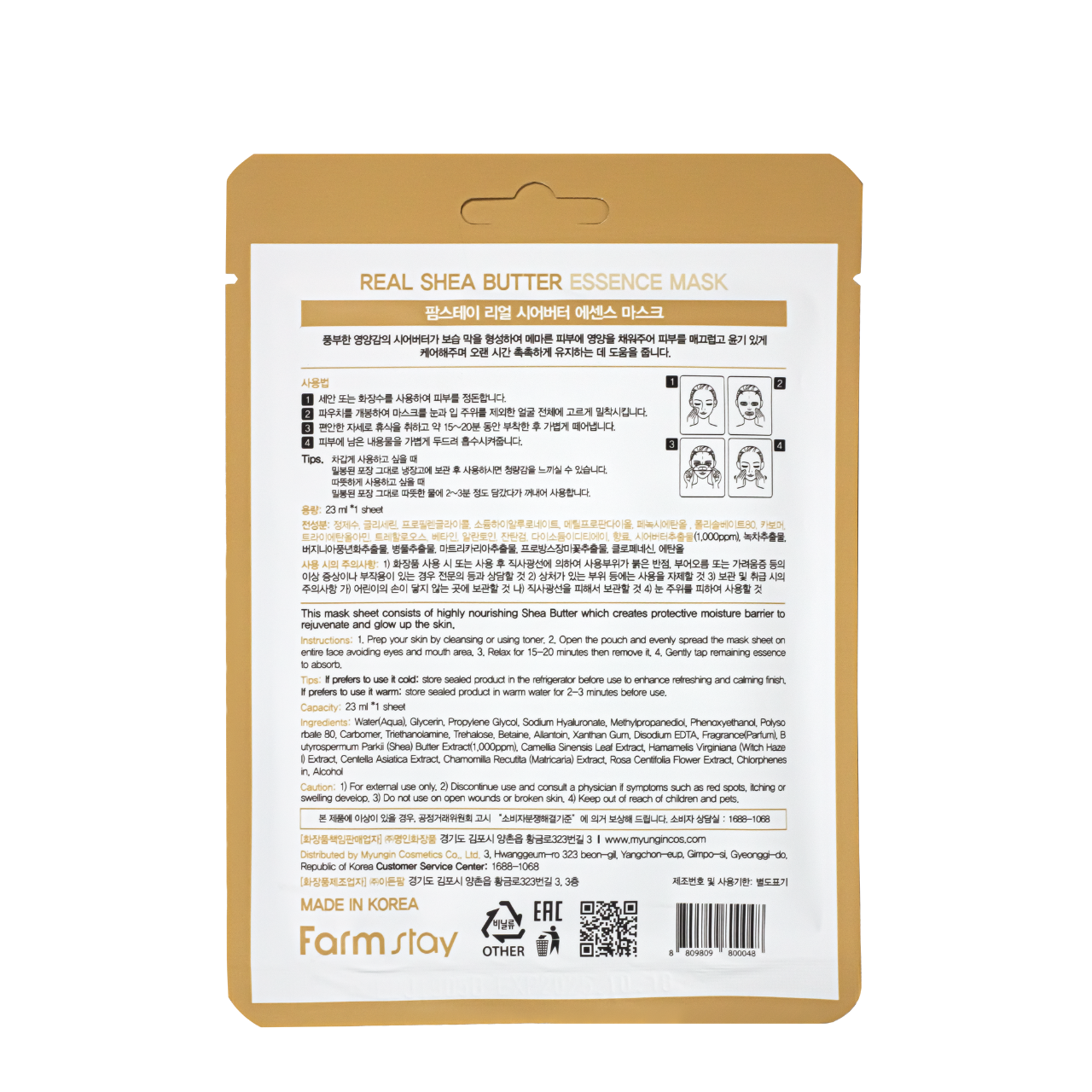Тканинна маска для обличчя з олією ши FarmStay Real Shea Butter Essence Mask сприяє усуненню лущень і подразнень, які виникають у зв'язку з зневодненням, робить шкіру більш гладкою та ніжною, захищає від передчасного в'янення, вирівнює та оздоровлює тон. Відмінно підійде власникам сухої, зневодненої шкіри. Поживна есенція миттєво заспокоює стягнуту шкіру та дарує відчуття комфорту.