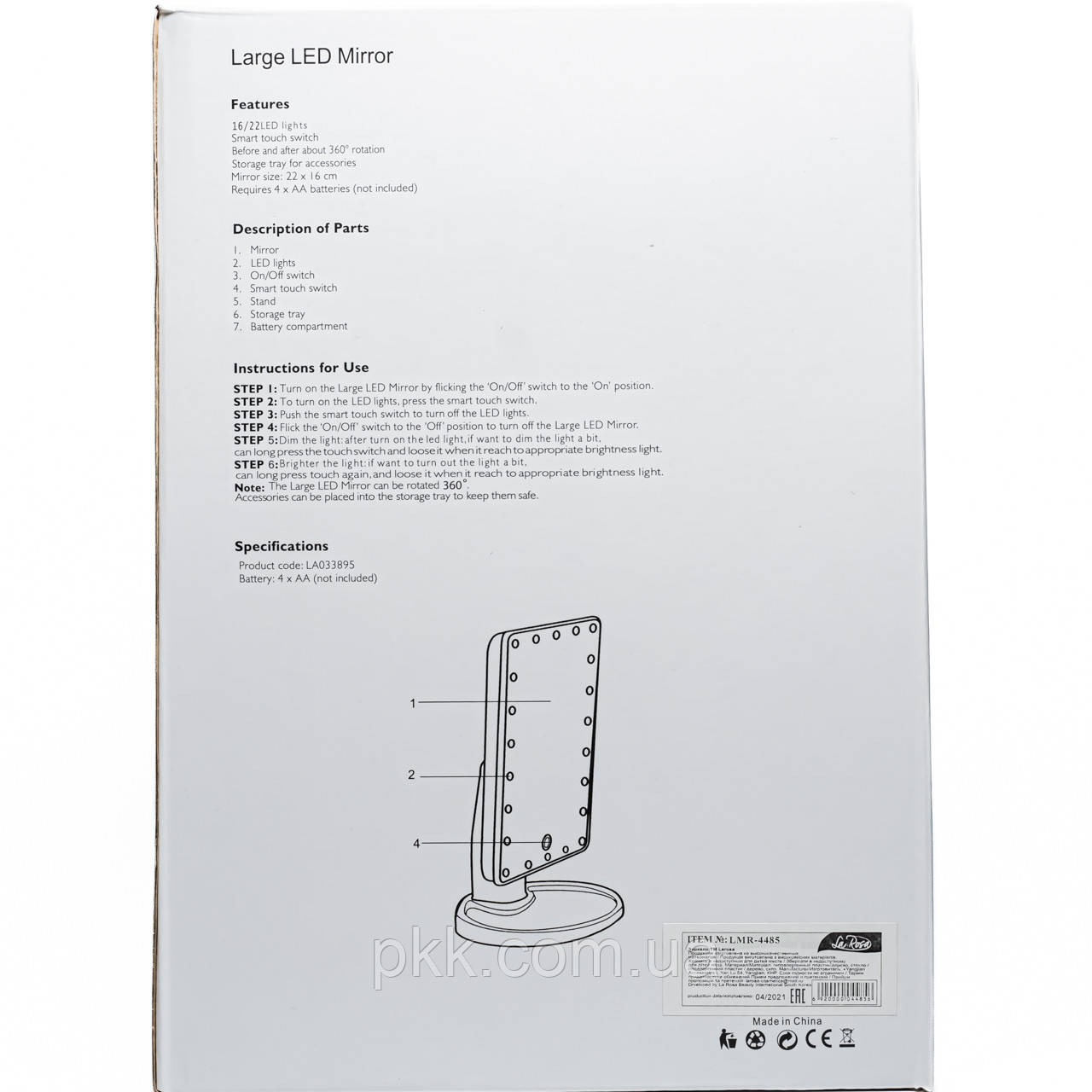 Включить и выключить зеркало можно при помощи специальной сенсорной кнопки. Освещение работает за счет обычных батареек. Специальная подставка позволит разместить на ней различные косметические мелочи, например, губную помаду, пудру, тени для глаз или что-нибудь другое, а свободное вращение на 180° позволяет зафиксировать косметическое зеркало в удобном для вас положении.