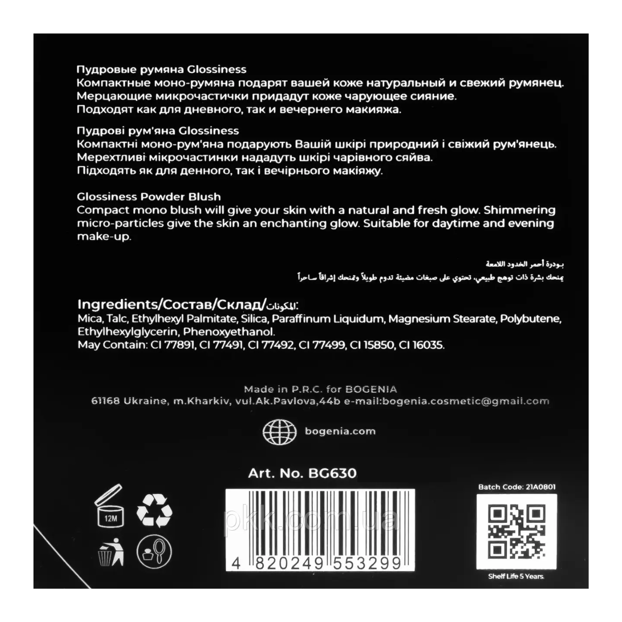 Рум'яна компактні одинарні Bogenia Glossiness BG630 матові та шимерніКомпактні одинарні рум'яна від турецького бренду Bogenia подарують шкірі природний та свіжий рум'янець. Шовковиста і ніжна текстура легко і рівномірно лягає на шкіру і добре розтушовується.Особливості:високопігментована формула;
