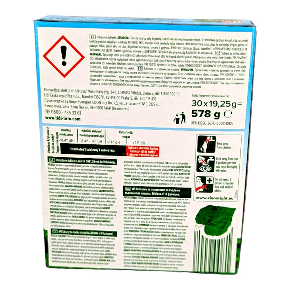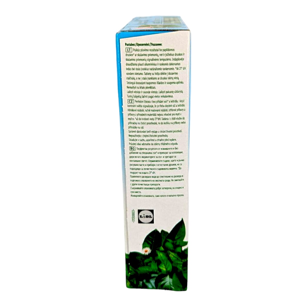 Таблетки All-in-one - миття, ополіскування, пом'якшення води, сіль для посудомийки. Екологічні складники передбачають миття навіть дитячого посуду. Таблетки забезпечують оптимальні результати миття посуду навіть при стійких забрудненнях. Функція солі та полоскання забезпечує блискучий блиск і протидіє водяним плямам і шкідливим відкладенням вапна. Таблетки мають інтегрований захист скла, що зменшує помутніння внаслідок частого миття (корозія скла). Це зберігає скляний посуд оптимально довше як новий - для тривалої чистоти та блискучого блиску.