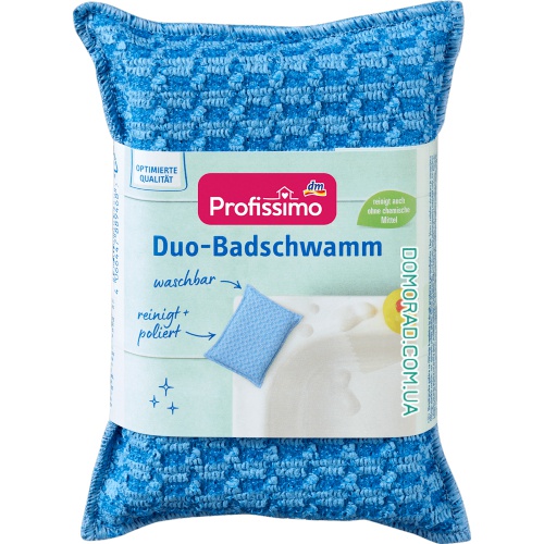 Губка для ванни Profissimo очищає ефективно і надійно. З різними сторонами губку можна використовувати універсально. Сіра сторона забезпечує ретельне очищення всіх гладких поверхонь, таких як стільниці, плитка, хром або кераміка завдяки 3D -структурі. Очищення без подряпин та для блиск без подальшого висихання завдяки зеленій стороні. Результат: блискуча ванна кімната.