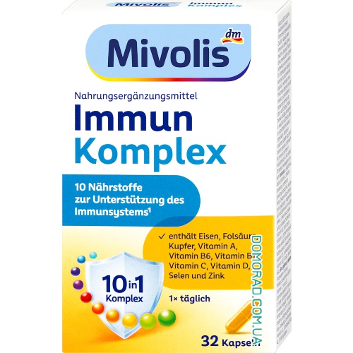 Імунний комплекс Mivolis підтримує захисні сили організму. Комлекс містить десять мікроелементів для імунної системи. Залізо, фолієва кислота, мідь, селен, вітамін А, вітамін В12, вітамін В6, вітамін С, вітамін D і цинк не тільки допомагає підтримувати імунітет, але і виконує різноманітні завдання в організмі.
