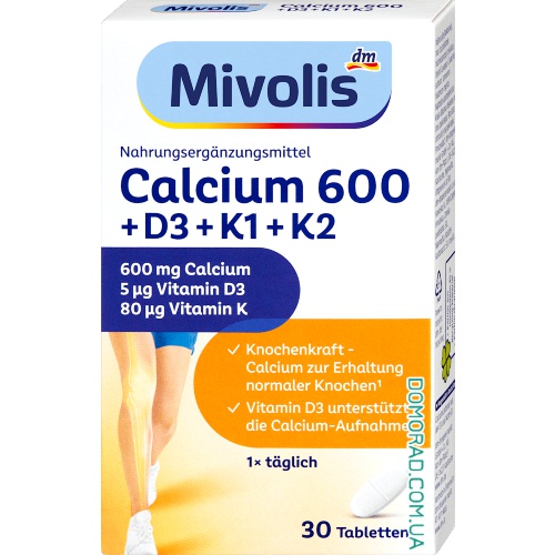 Mivolis Calcium 600 + Vitamin D3 + Vitamin K1 + K2 містить важливі будівельні блоки для нормальних кісток. Кальцій необхідний для підтримки кісток і зубів і сприяє нормальній роботі м’язів. Однак потреба в кальції не завжди покривається їжею в певних харчових звичках або життєвих ситуаціях. Вітамін D допомагає підтримувати кістки та зуби. Дієтична добавка з препаратом Міволіс Кальцій 600 + вітамін D3 + К1 + К2 може бути особливо корисною під час вагітності та лактації, у фазах росту для підлітків або при однобічній дієті.