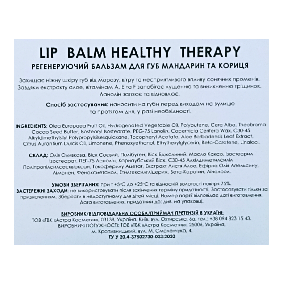 Бальзам захищає шкіру губ від морозу, вітру та несприятливого впливу сонячних променів. Комплекс олій та вітамін зволожують та підтримують губи у здоровому стані. Містить оливкову олію, ланолін, алое, вітамін E, запобігає лущенню та виникненню тріщин. Бальзам містить протисонцевий фактор SPF 15. Після застосування бальзаму губи стають м'якими, зволоженими, набувають доглянутого вигляду. Регулярне використання засобу запобігає появі тріщин та ранок.