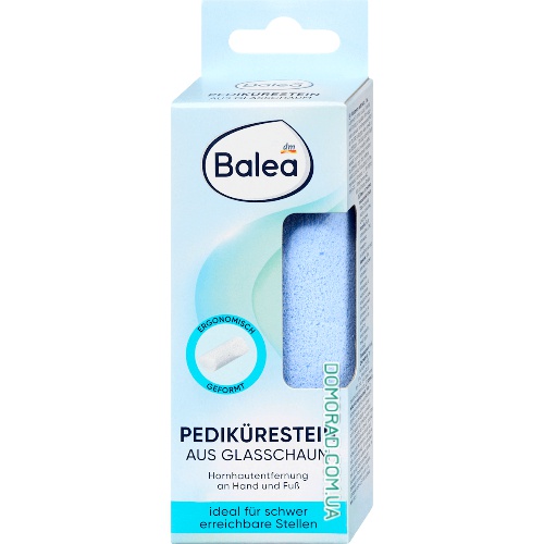Педикюрний камінь Balea виготовлений зі спіненого скла. Грубі пори використовуються для ефективного і швидкого видалення мозолів і мозолів на руках і ногах. Також видаляє грубі забруднення у поєднанні з водою та милом. Завдяки ергономічній краплеподібній формі він підходить для великих поверхонь, а також для простору між пальцями ніг.
