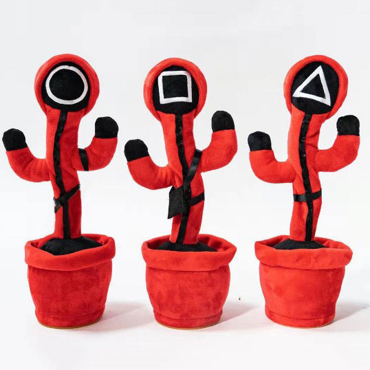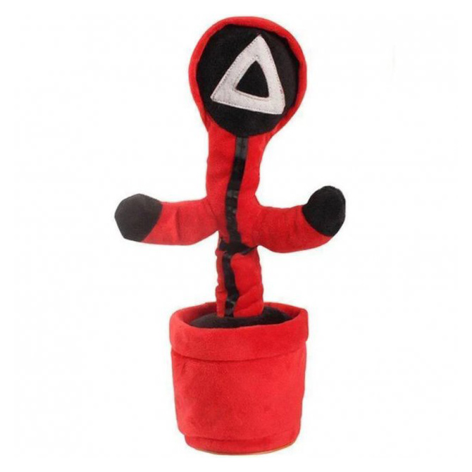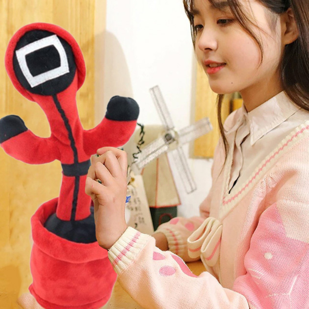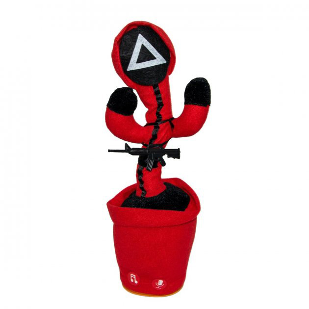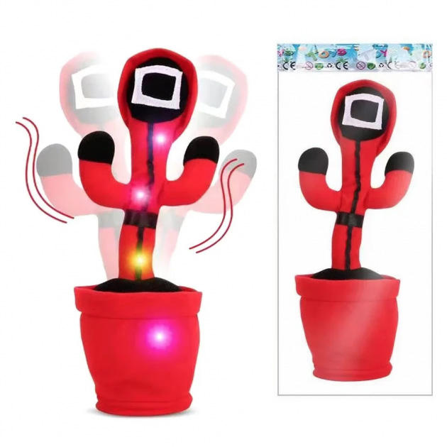 Теперь танцующий кактус – это не просто новая музыкальная говорящая игрушка, а ещё и фигурка в стиле сериала “Игра в кальмара”. Игрушка представляет из себя шевелящуюся поющую разговаривающую куклу в форме кактуса в горшке с большими глазами и улыбающимся лицом.