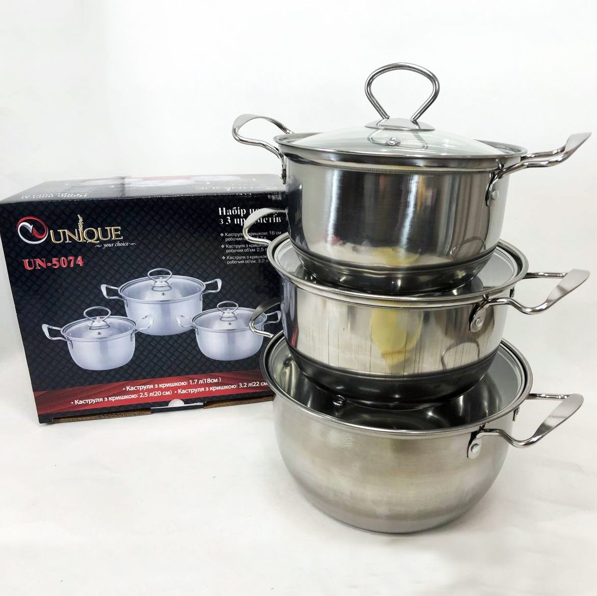 Набор из трёх кастрюль UNIQUE UN-5074 с крышками 18,20,22 см содержит в себе кастрюли, которые быстро нагреваются, равномерно распределяя тепло по всей площади основания и долго хранят тепло. Набор посуды прекрасно подойдет для всех видов плит, кроме индукционных. На крышках и по бокам кастрюль расположены клепаные, не нагревающиеся ручки. Прозрачные крышки из жаропрочного стекла позволит наблюдать за всем процессом приготовления пищи от самого начала и до конца, стекло крышки не будет запотевать, так как имеет отверстие для выхода пара.