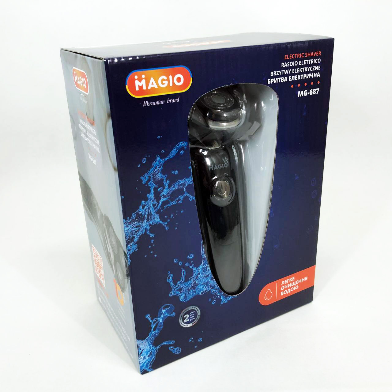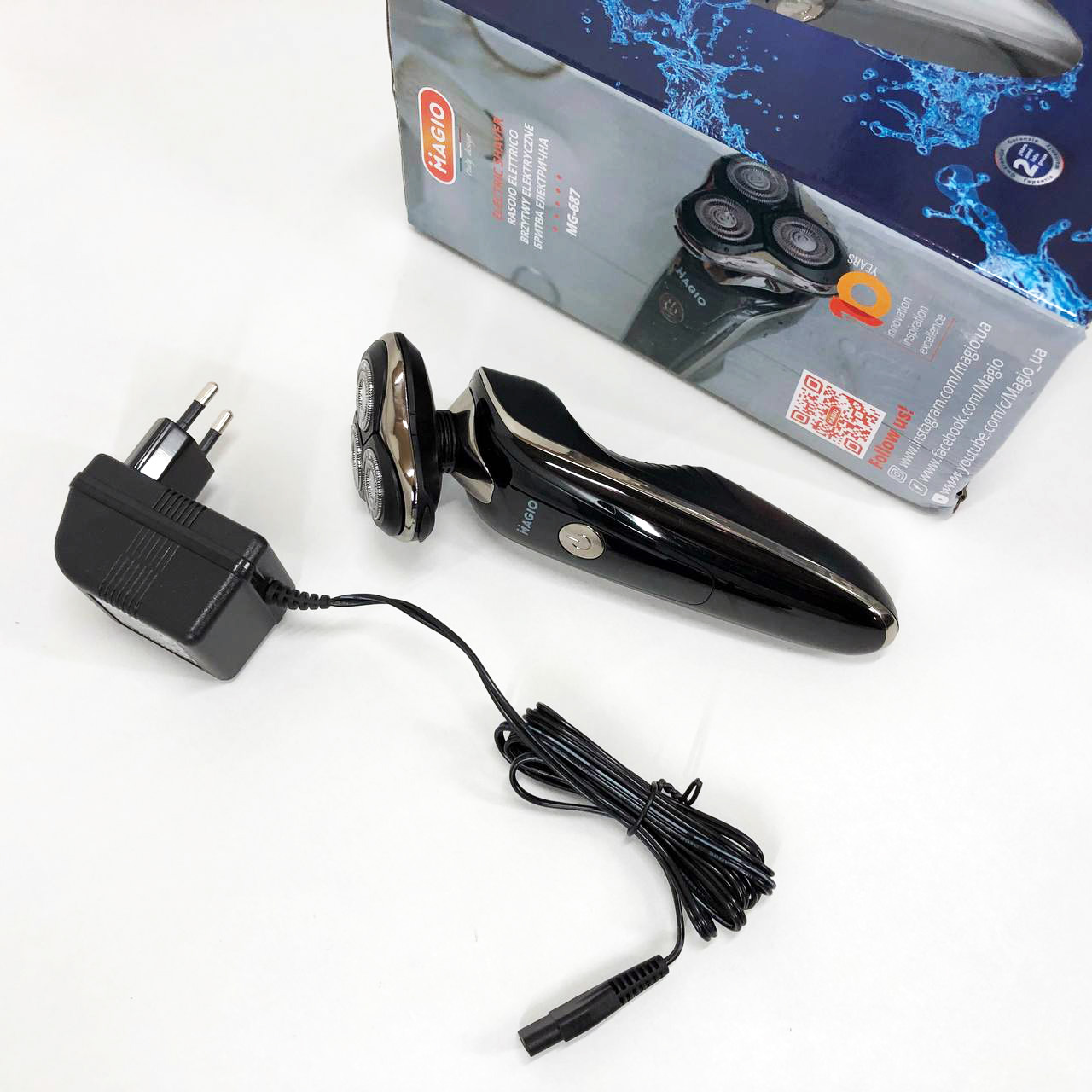 Электробритва MG-687 для влажного и сухого бритья с тремя подвижными бритвенными головками обеспечит идеальный результат за счет плотного прилегания вращающихся лезвий к коже. Эта модель роторной бритвы с качественными двойными лезвиями и системой повторения контуров лица деликатно относится к коже. Аккумулятора после 8-ми часовой зарядки хватает на 45 минут автономной работы. Ухаживать за бритвой проще простого, достаточно просто промыть ее режущий блок под проточной водой не более 5-ти секунд. Три плавающих головки, триммер для подравнивания висков, эргономичная рукоятка делают использование прибора комфортным и безопасным.