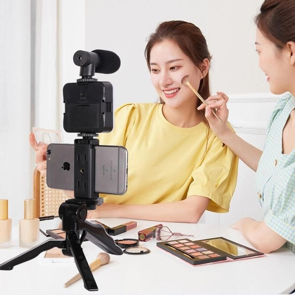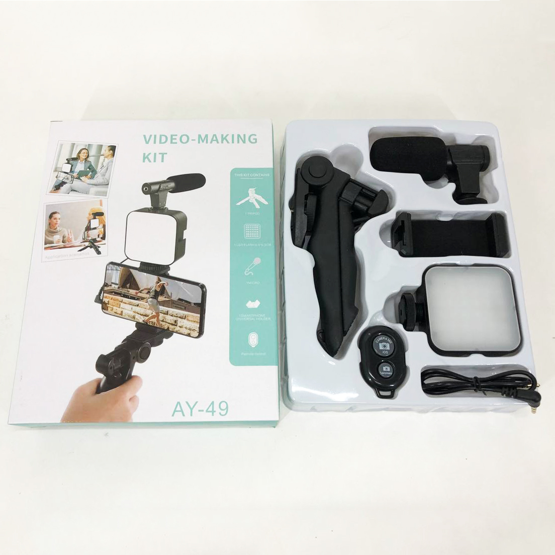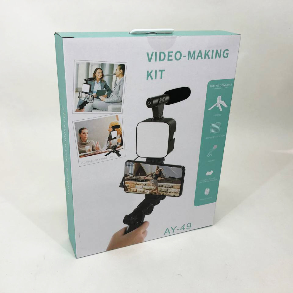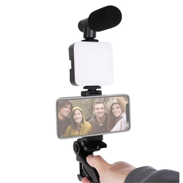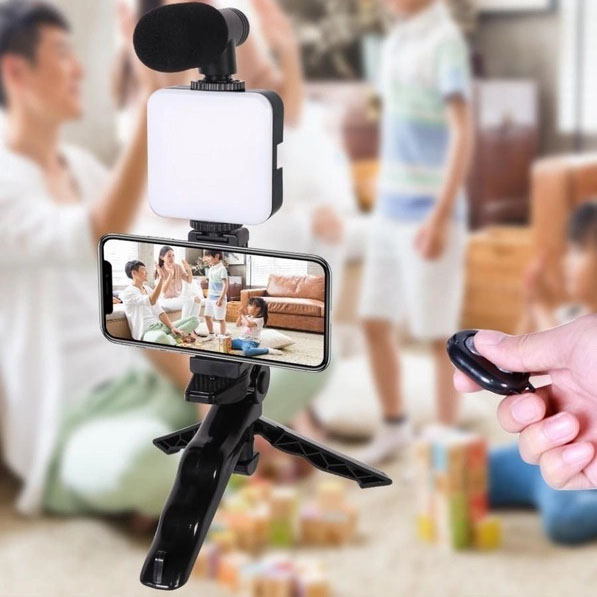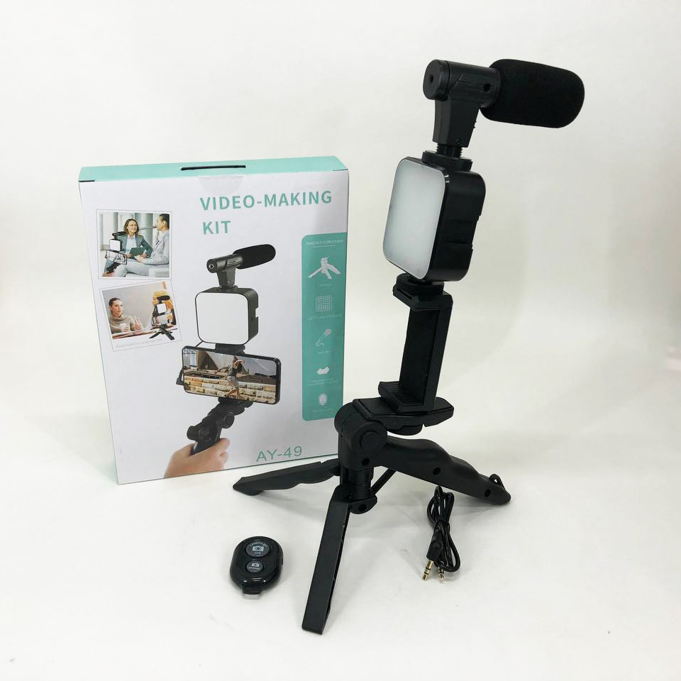 В набор входит: микрофон, подсветка, трипод, держатель для телефона и Bluetooth кнопка.