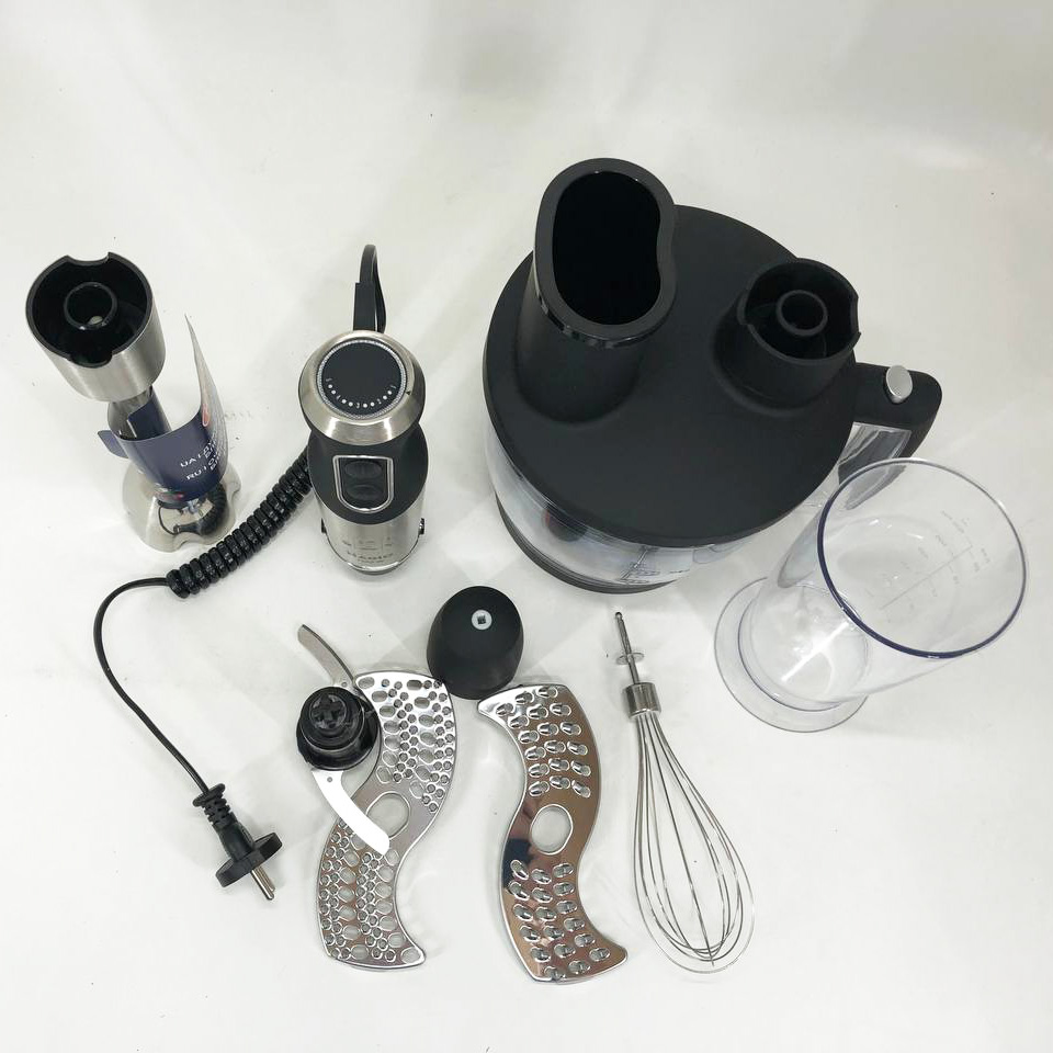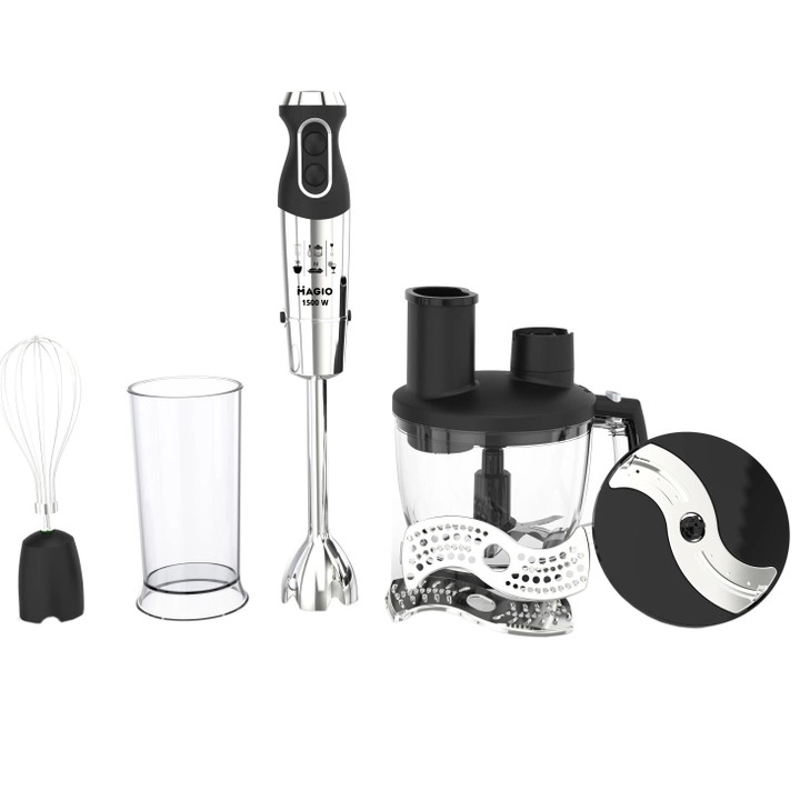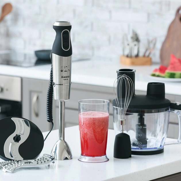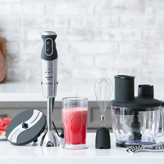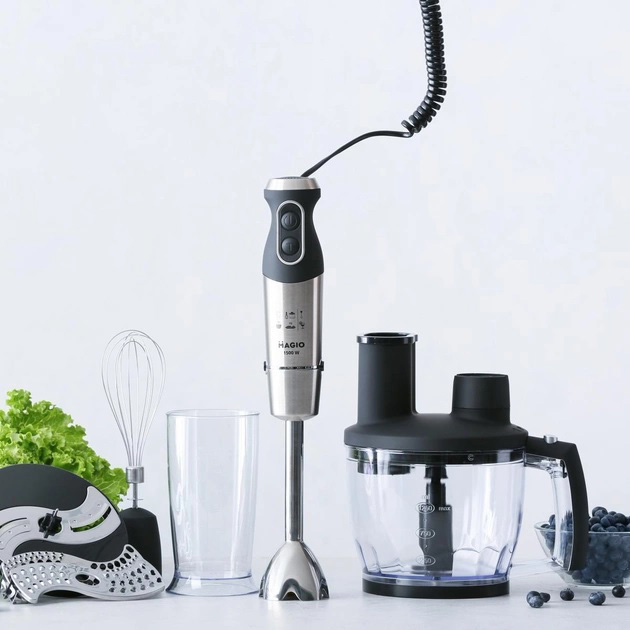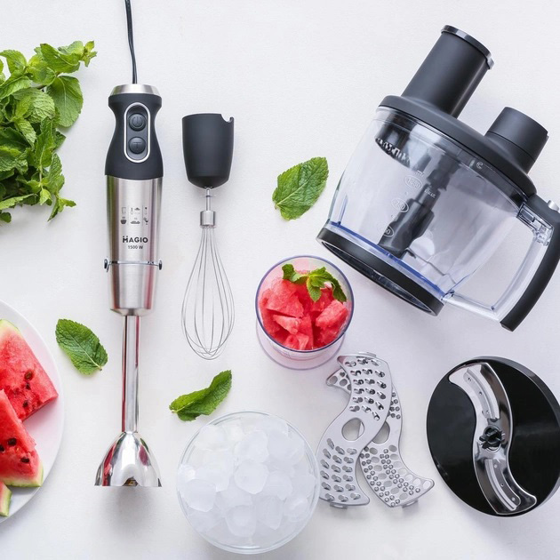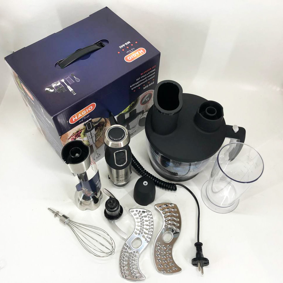 Блендерный набор MG-642 позволит вам разнообразить ваше меню и приготовить новый кулинарный шедевр. Мощность блендера составляет 1500 Вт, что обеспечивает бесшумную эффективную работу в течение длительного времени. Погружная часть выполнена из нержавеющей стали, а нож с ТИТАНОВЫМ покрытием — залог устойчивости к износу и долговечности,еще одним достоинством блендера являеться спиральный провод который не будет мешать во время приготовления. Эргономическая рукоятка с приятным покрытием SOFT TOUCH. Блендер может работать на 13 плавно переключающихся скоростях. Переключатель находится на рукоятке прибора, что весьма удобно. В комплект входит пластиковый мерный стакан, венчик для взбивания и мини-комбайн с покрытием SOFT TOUCH с 3 насадками - объем 1250 мл. Насадки: нарезка, шинковка и терка. Эти свойства в сочетании с компактным дизайном делают блендер незаменимым помощником на вашей кухне.