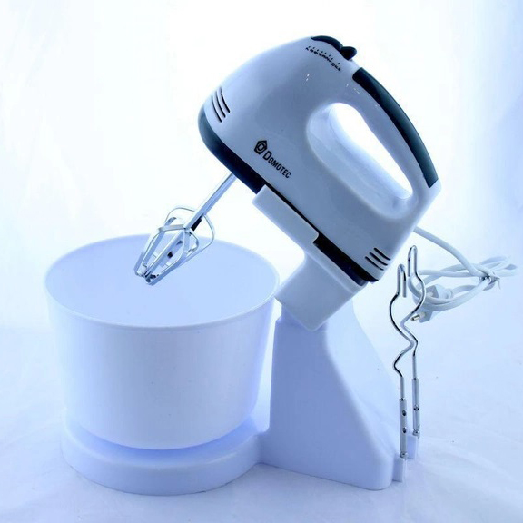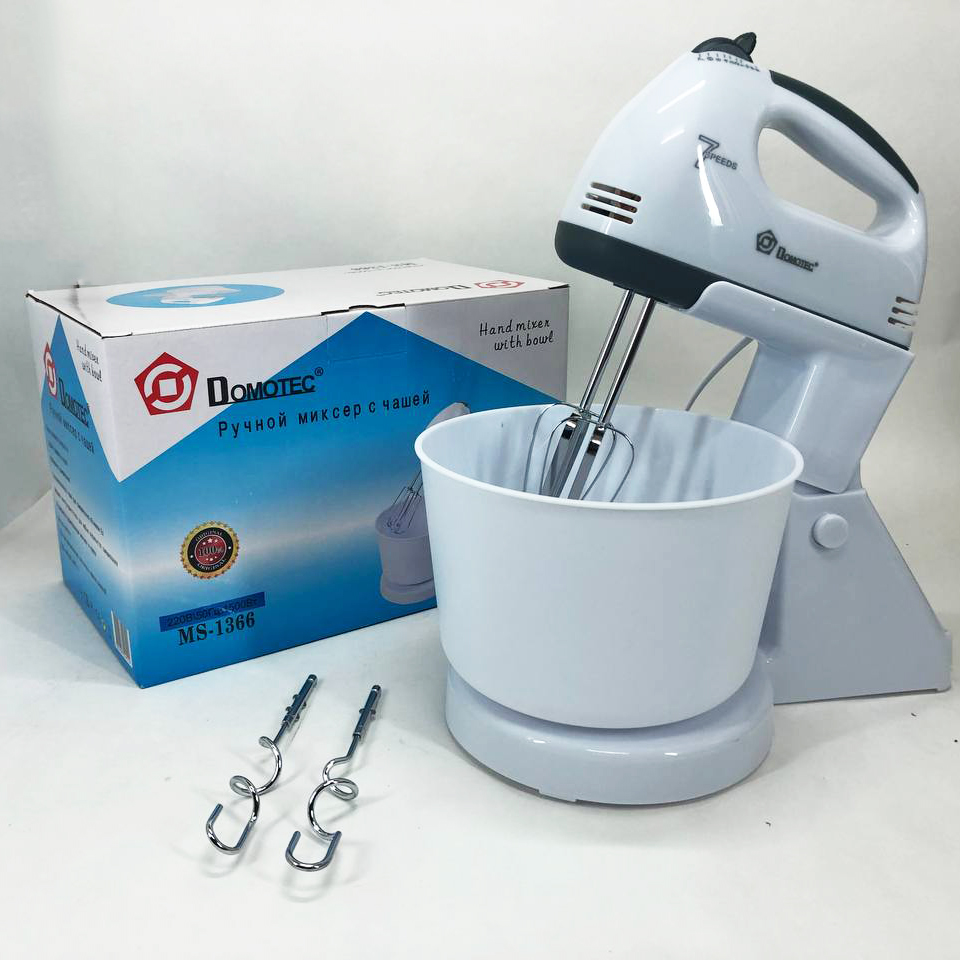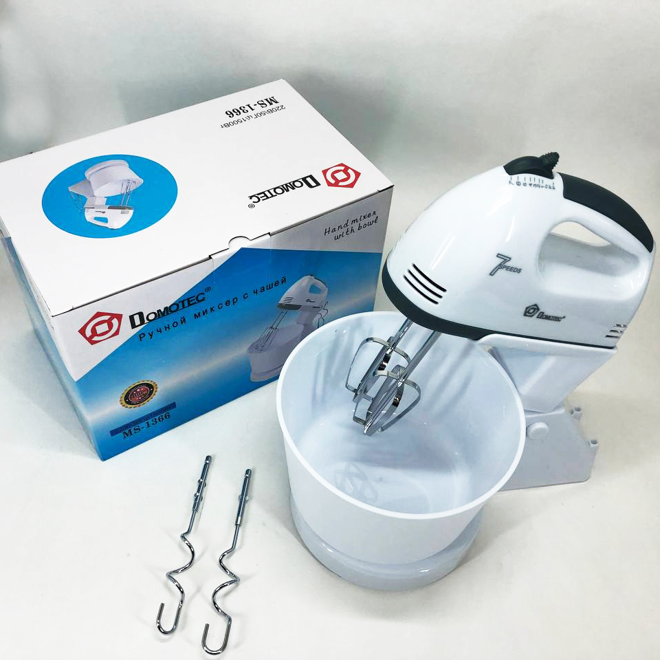 Миксер с чашей Domotec MS 1366 - очень удобный, легкий в использовании и очистке. Корпус миксера подставка и чаша изготовлены из пластика, а насадки из нержавеющей стали, продуманная до мелочей эргономика придает дополнительный комфорт в использовании данного миксера. MS 1366 имеет 7 скоростных режимов работы для взбивания продуктов различной плотности, его мощность позволяет легко взбивать яйца, соусы или бисквитное тесто. В комплекте Domotec MS-1366 имеется большая чаша, на которую легко устанавливается миксер, тем самым превращая его в стационарный прибор, что позволяет освободить руки на кухне. Также имеются два венчика для взбивания и дополнительные крюки для замешивания теста, что по достоинству оценят хозяйки, которые любят радовать свою семью различной выпечкой.